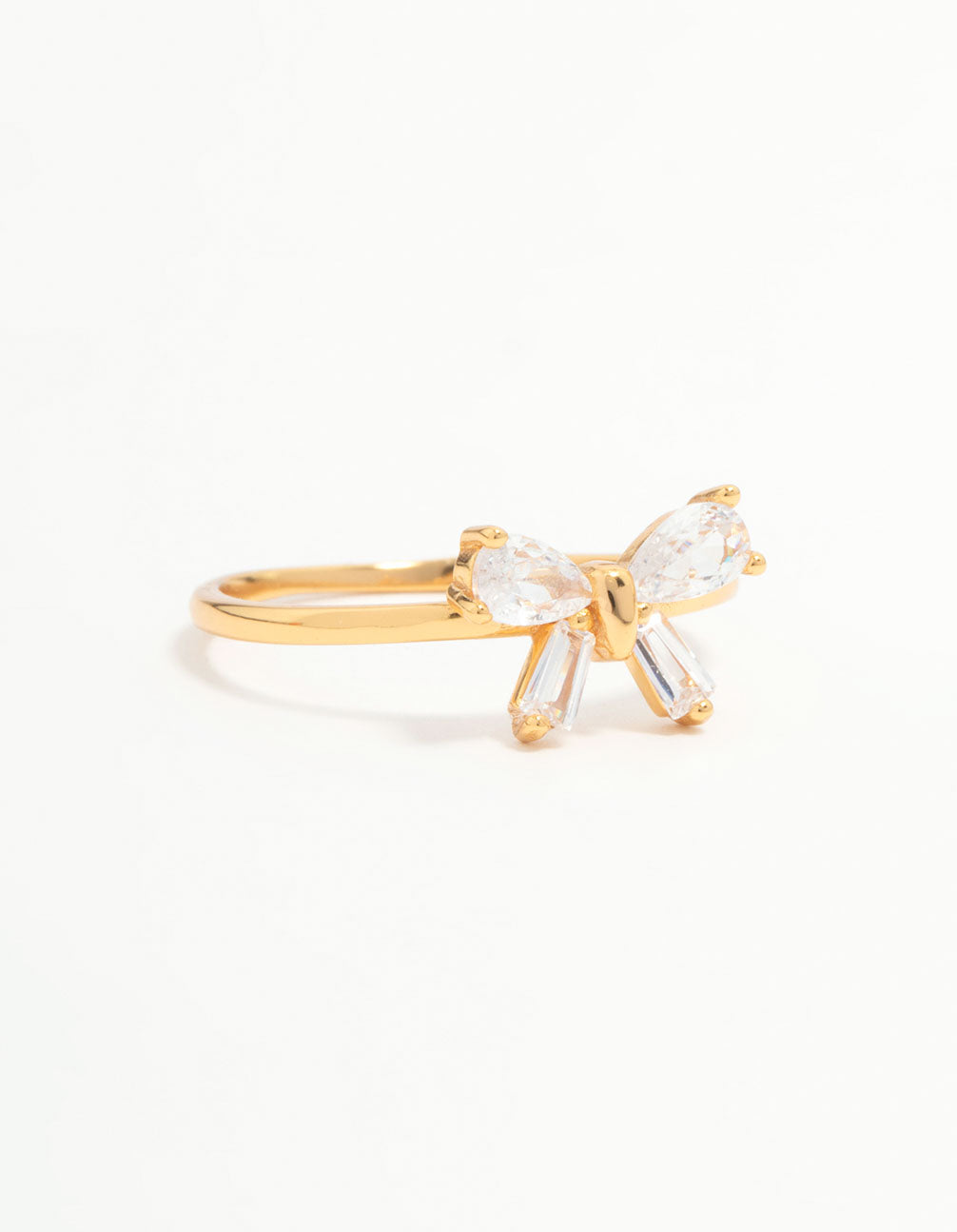 Add some flirty flair to your look with this gold-plated ring! Featuring a dazzling cubic zirconia bow design, it's perfect for a touch of coquette glam.