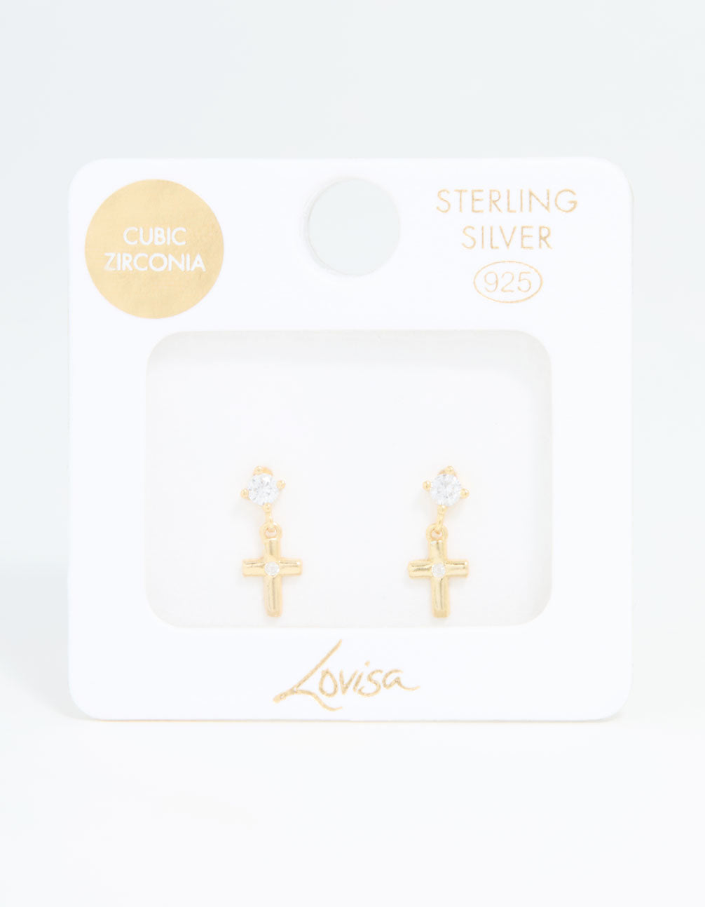 Add a little sparkle to your look with these Gold Plated Sterling Silver Cubic Zirconia Cross Drop Earrings. Combining classic stud earring style with a modern twist, they feature shimmering cubic zirconia crystals and a delicate cross design. Perfect for a special occasion or everyday glam, they pair effortlessly with anything from chic dresses to casual denim. Crafted from sterling silver with a sleek gold plating, these earrings are a versatile jewellery must-have. Whether you're dressing up for a night out or adding a touch of shine to your daytime look, these drop earrings are the perfect finishing touch.