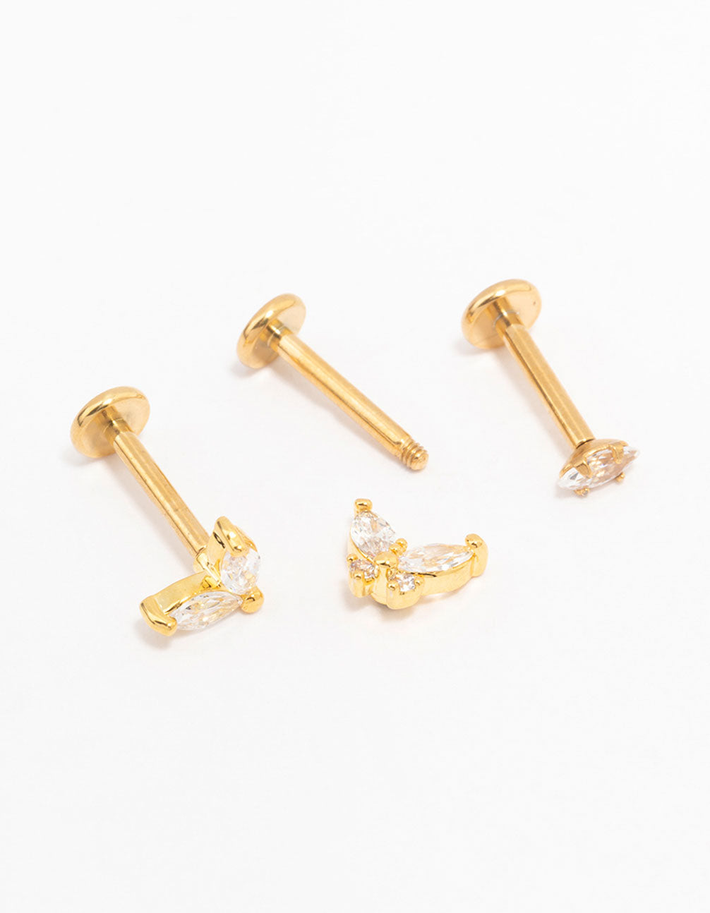 Get ready to dazzle with this trio of gold plated surgical steel flat back studs! Featuring a mix of butterfly and marquise shapes, these studs are perfect for stacking or wearing solo to elevate any look!