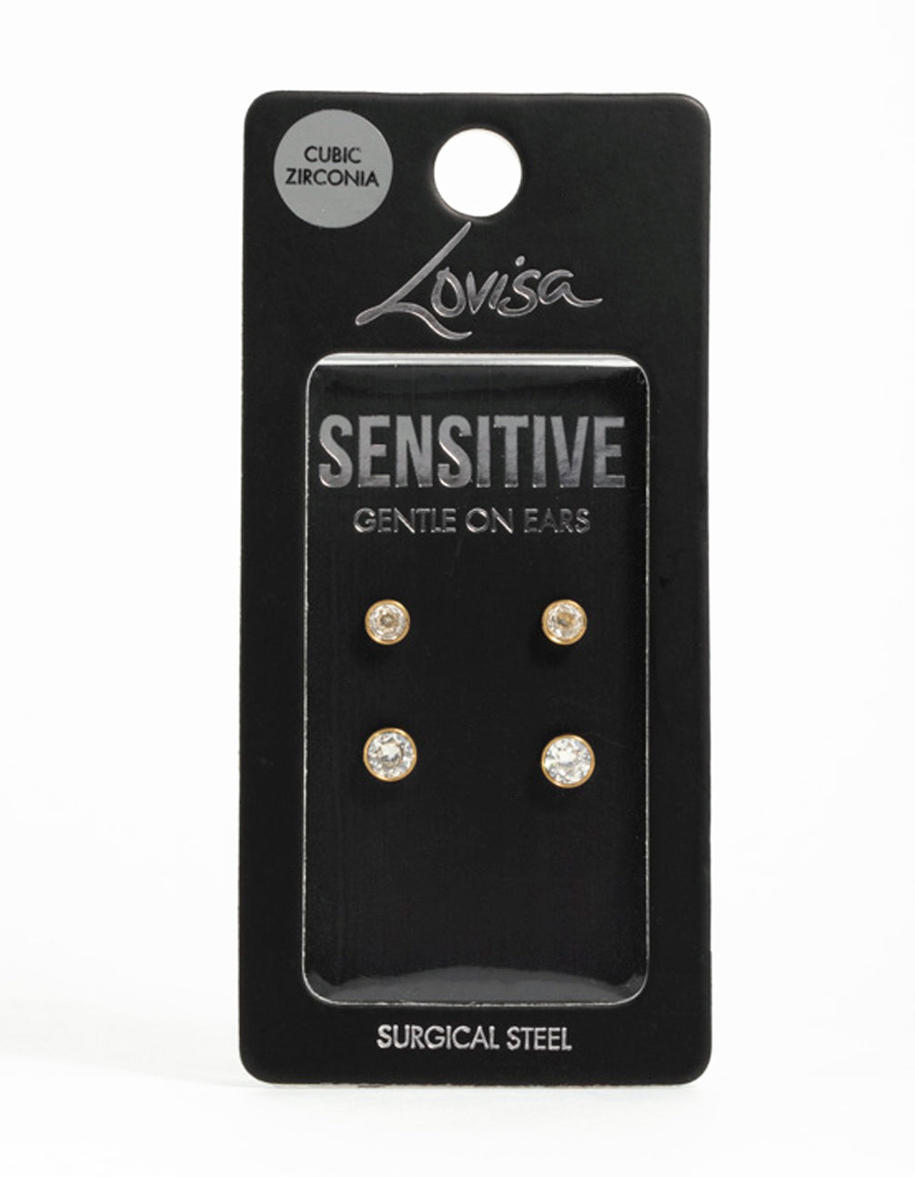 Add sparkle to your everyday with these Gold Plated Surgical Steel Cubic Zirconia Bezel Stud Earrings. Designed for sensitive ears, these chic studs feature timeless bezel set cubic zirconia crystals.