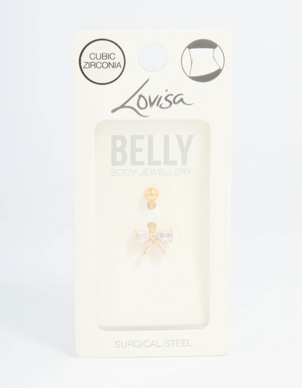 Add a touch of charm to your look with this Gold Plated Surgical Steel Cubic Zirconia Bow Belly Bar. This belly bar features a cubic zirconia crystal bow design for a playful vibe.