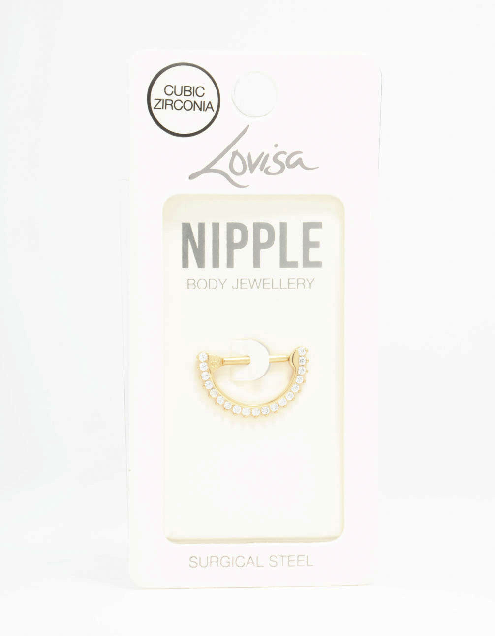Add some sparkle to your nipple piercing with this gold plated surgical steel nipple ring. This nipple ring features a half hoop design encrusted with cubic zirconia crystals.
