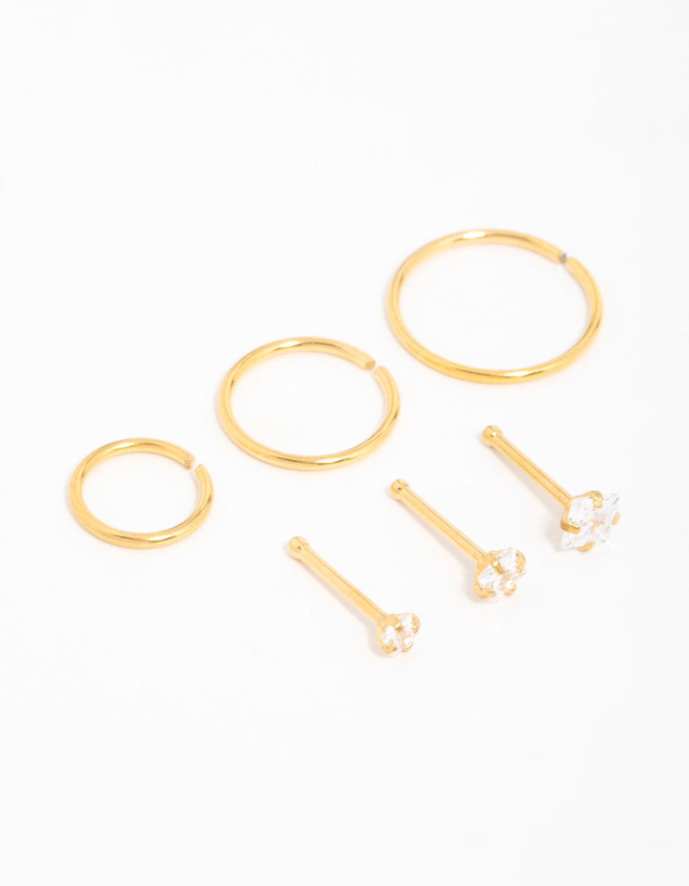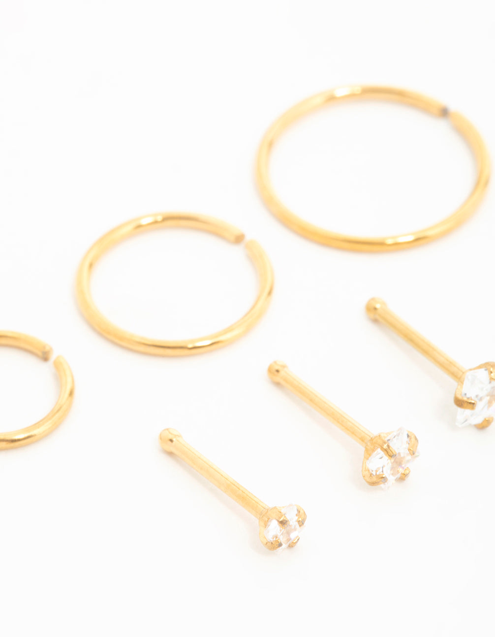 Gold Plated Surgical Steel Cubic Zirconia Stud & Hoop Nose Piercings 6-Pack