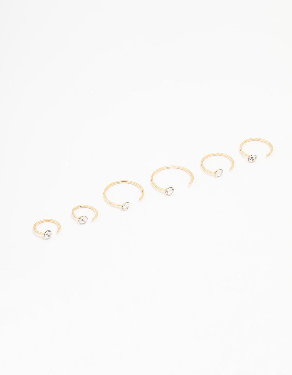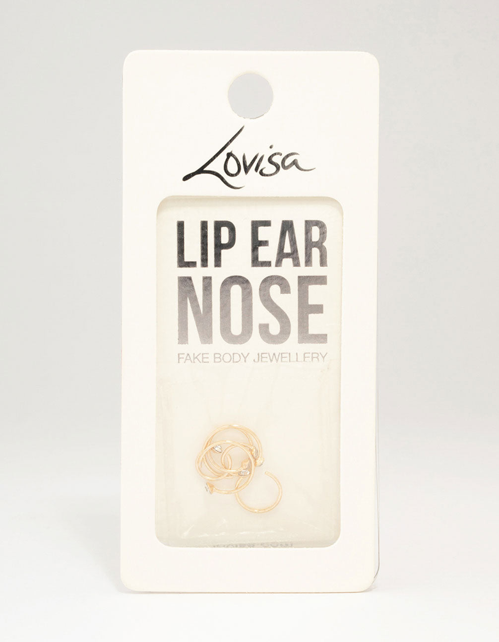 Customise your look with our selection of premium, genuine surgical steel piercing jewellery. This piercing pack includes six individual, gold plated faux piercings. Perfect for styling as a lip, ear or nose piercing!