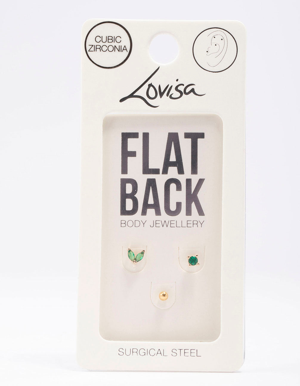 Gold Plated Surgical Steel Emerald Marquise Leaf Flat Back 3-Pack