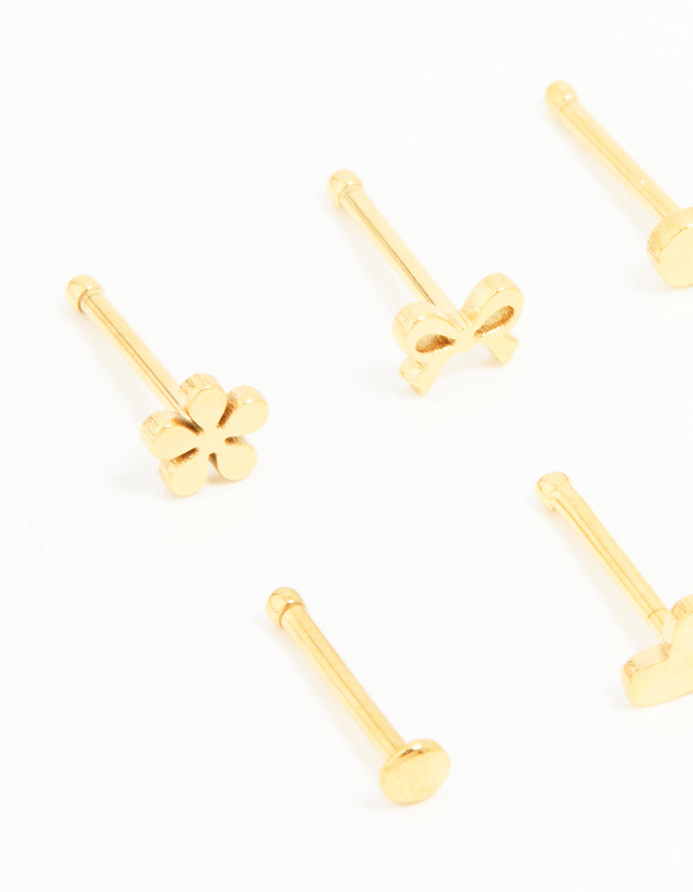 Gold Plated Surgical Steel Heart, Bow & Flower Nose Stud 6-Pack