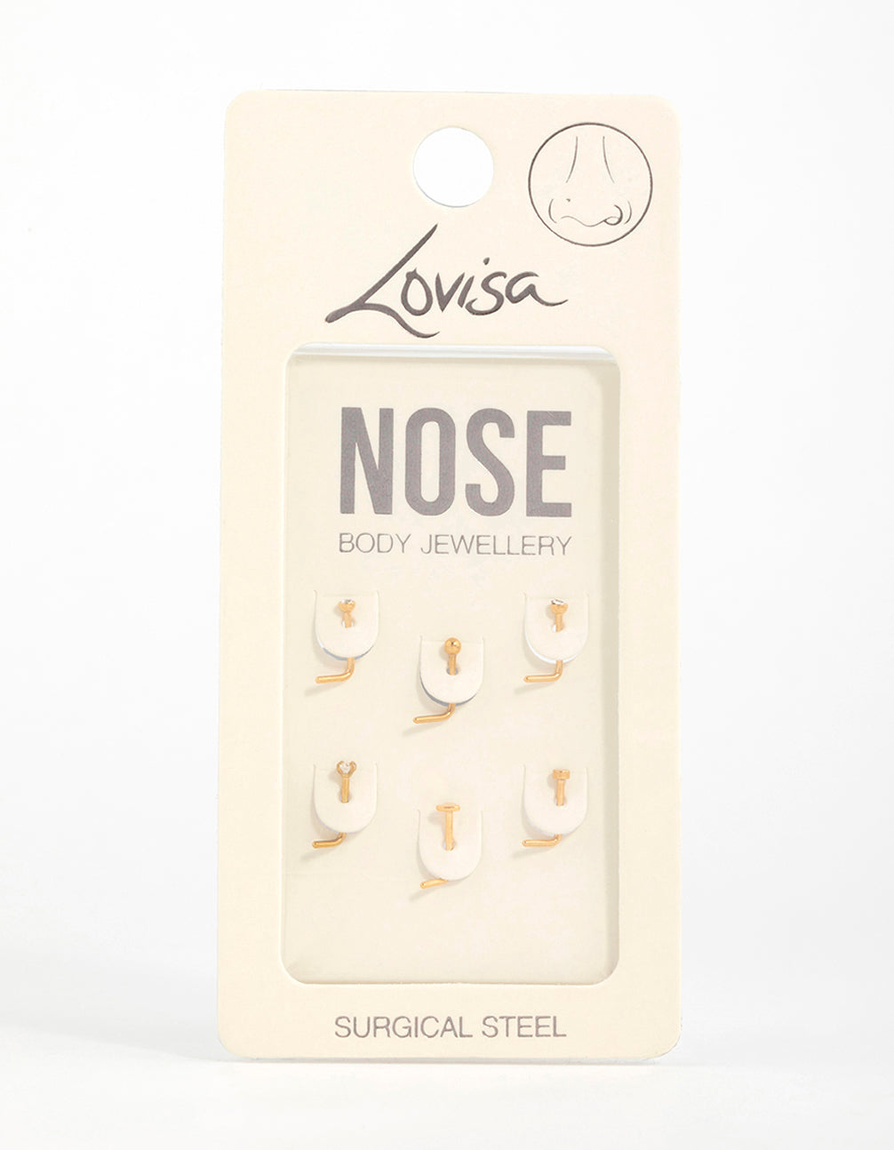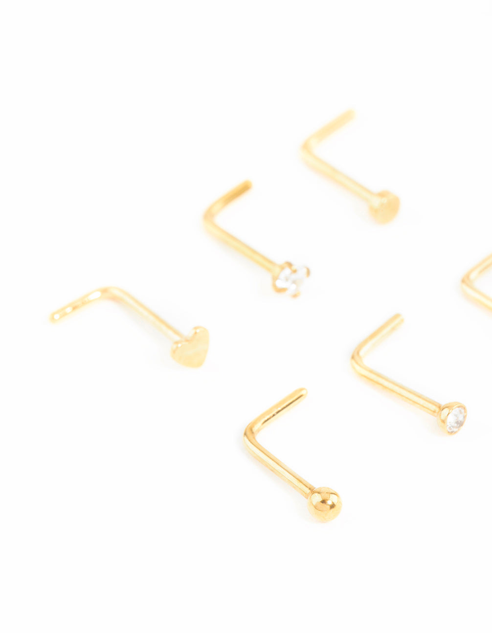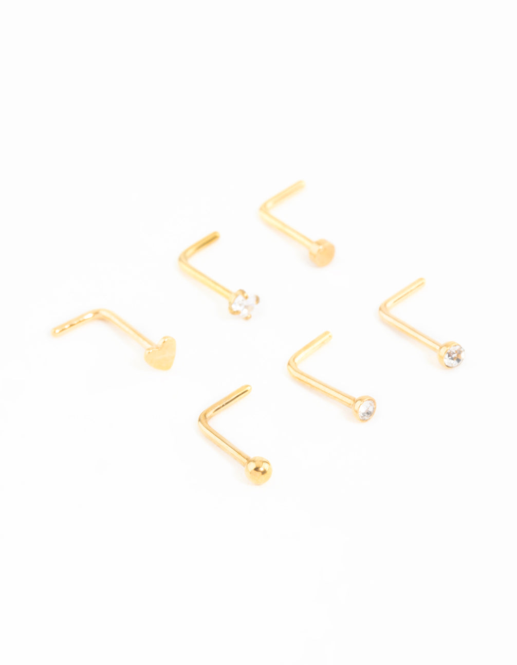 Add some sparkle to your nose piercing with these Gold Plated Surgical Steel Heart Cubic Zirconia Nose Studs! This charming pack of six features delicate heart and classic shapes with sparkling accents, perfect for everyday hypoallergenic wear.