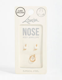 Upgrade your nose bling with this pack. This 3-pack includes a gold-plated spiral ring with cubic zirconia flowers, a classic cubic zirconia stud, and a sleek gold-toned stud. Perfect for any occasion, gentle on the skin, and effortlessly chic.