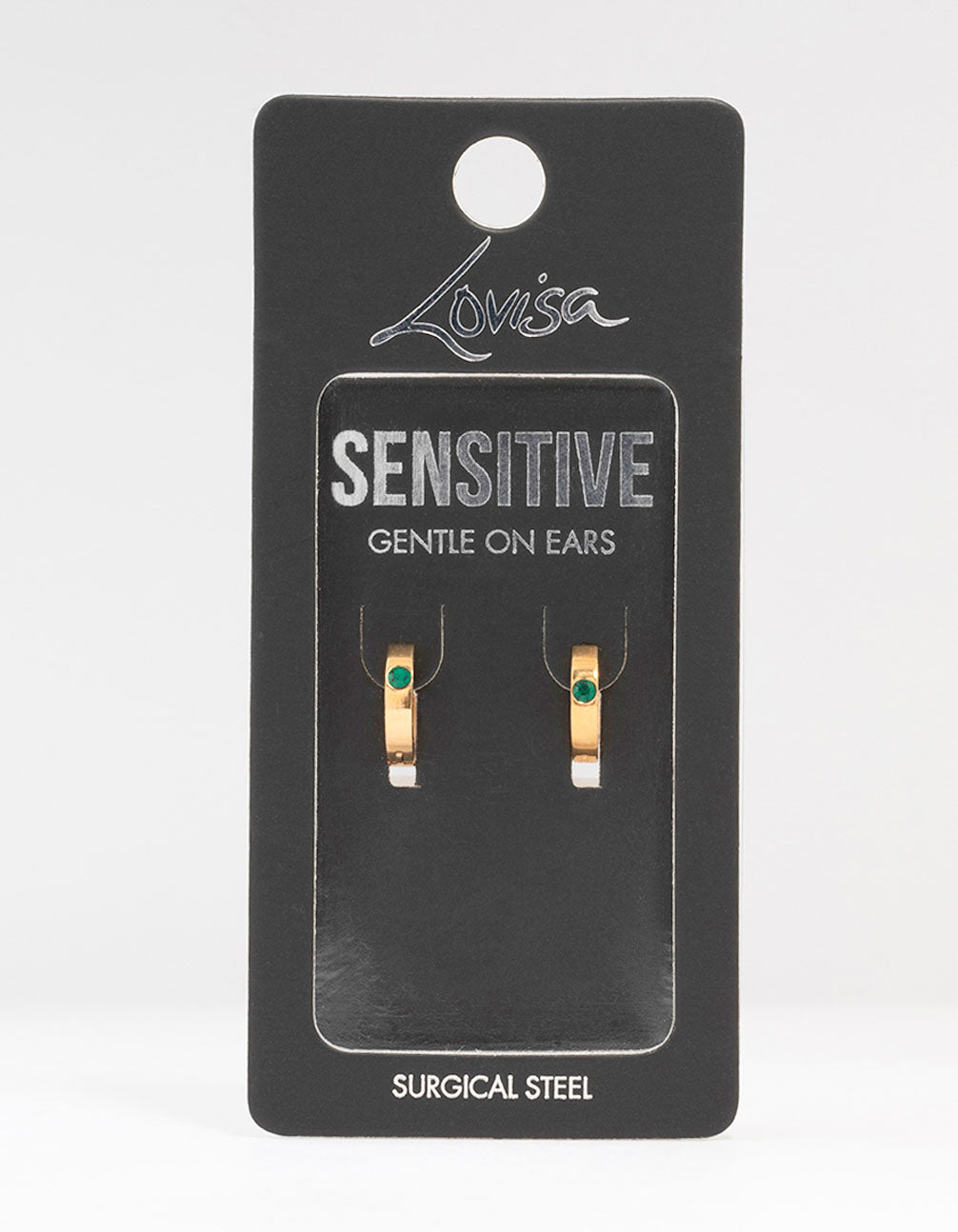 These striking huggie earrings are plated with real gold and made from surgical steel, perfect for sensitive ears and include a charming green diamante for a touch of glamour you can add to your stack.