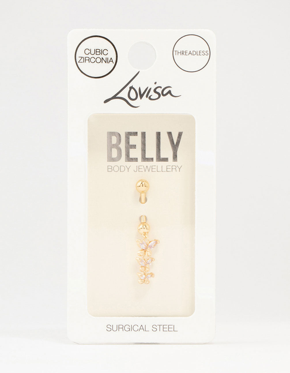 Up your navel game with this eye-catching gold-plated belly bar. Crafted from sleek surgical steel, its trio of cubic zirconia butterfly charms dangle gracefully, adding an edgy-yet-refined vibe to your middrif. This belly bar features a threadless style, for a secure fit and also makes it easier for stud to be removed.