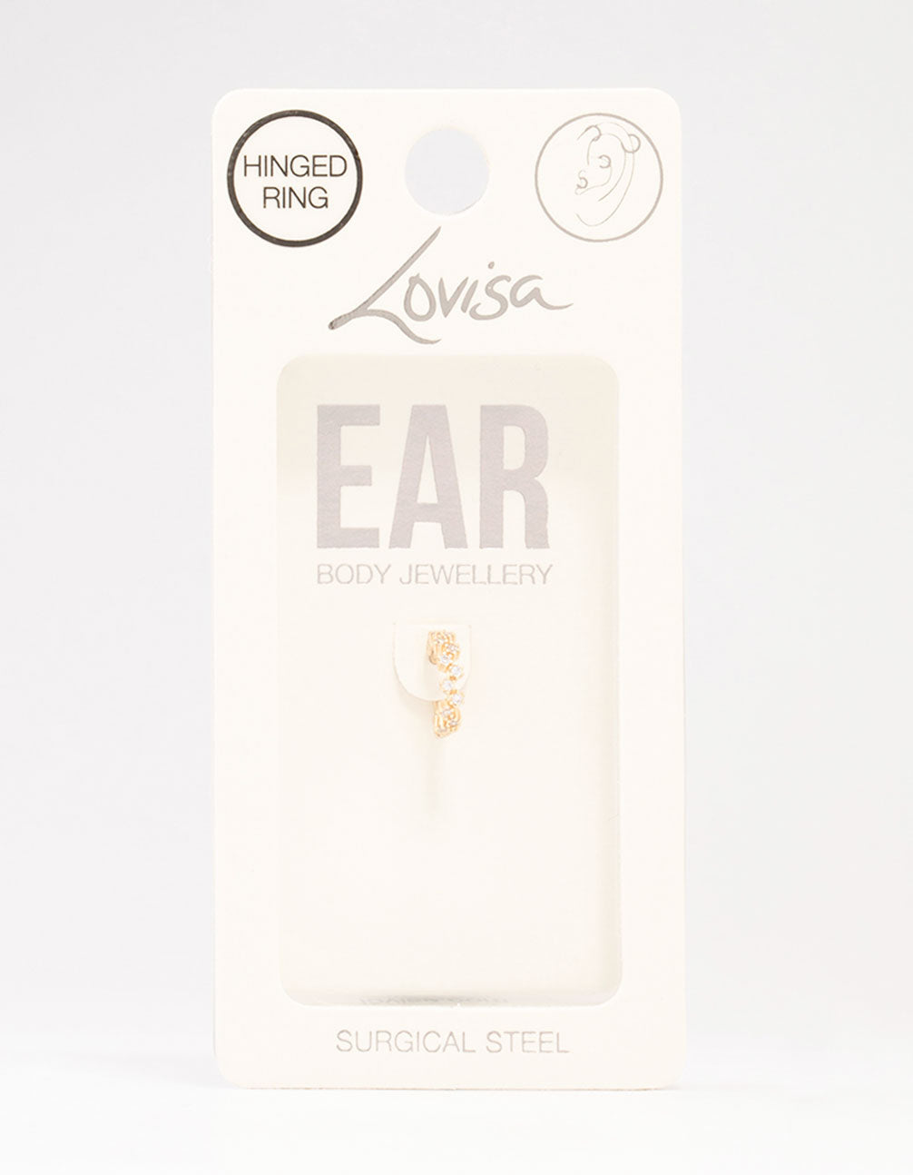 Add a dose of sparkle to your look with this pretty clicker ring. This clicker ring features gold plated surgical steel and zig zag set cubic zirconia crystals for a sparkly twist. Perfect for a helix, conch, tragus, or septum piercing.