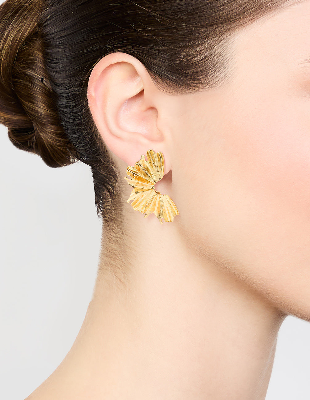 Turn heads with these Gold Plated Textured Fan Stud Earrings. These stud earrings feature a fan-inspired design with intricate texture details, all beautifully finished in gold plating for a luxe look. Perfect for adding a touch of sophistication to your everyday wardrobe, these earrings are versatile and effortlessly stylish. Pair them with a flowing dress for a chic evening vibe or jazz up your casual jeans-and-jumper combo. Whether you're searching for stud earrings, gold earrings, or unique statement jewellery, these textured beauties are your new go-to accessory.
