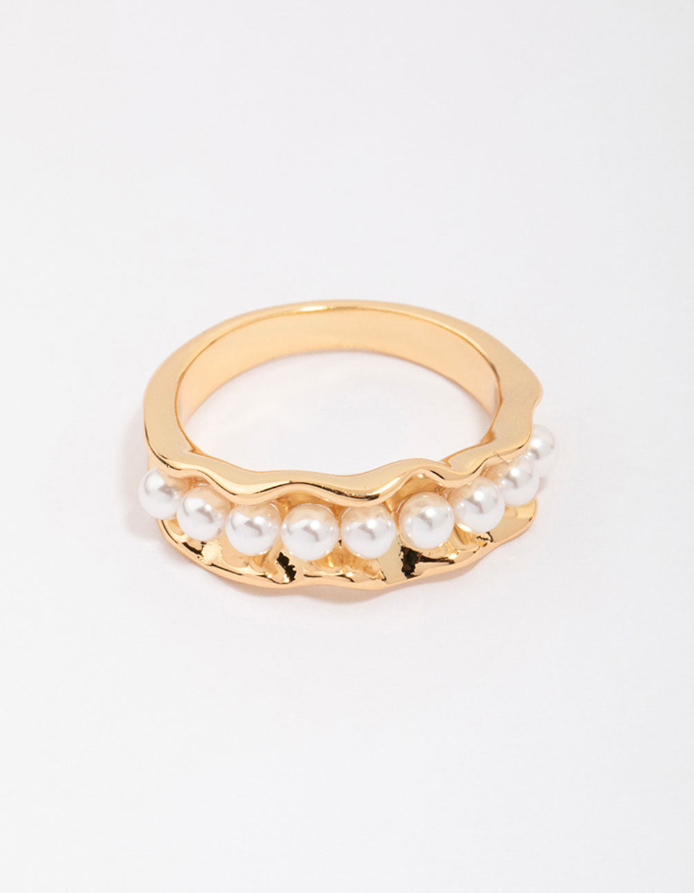 This band features a unique, molten gold texture adorned with a row of pearls for a sophisticated finish.