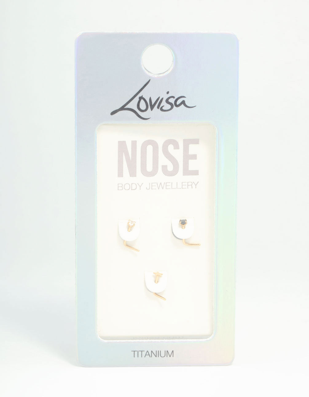 Upgrade your nose bling game with this nose stud trio. This pack features three fab designs: a star, a black diamante, and a classic round stud. Made from titanium with gold plating and sparkling diamante crystals. Perfect for glam and comfy wear.