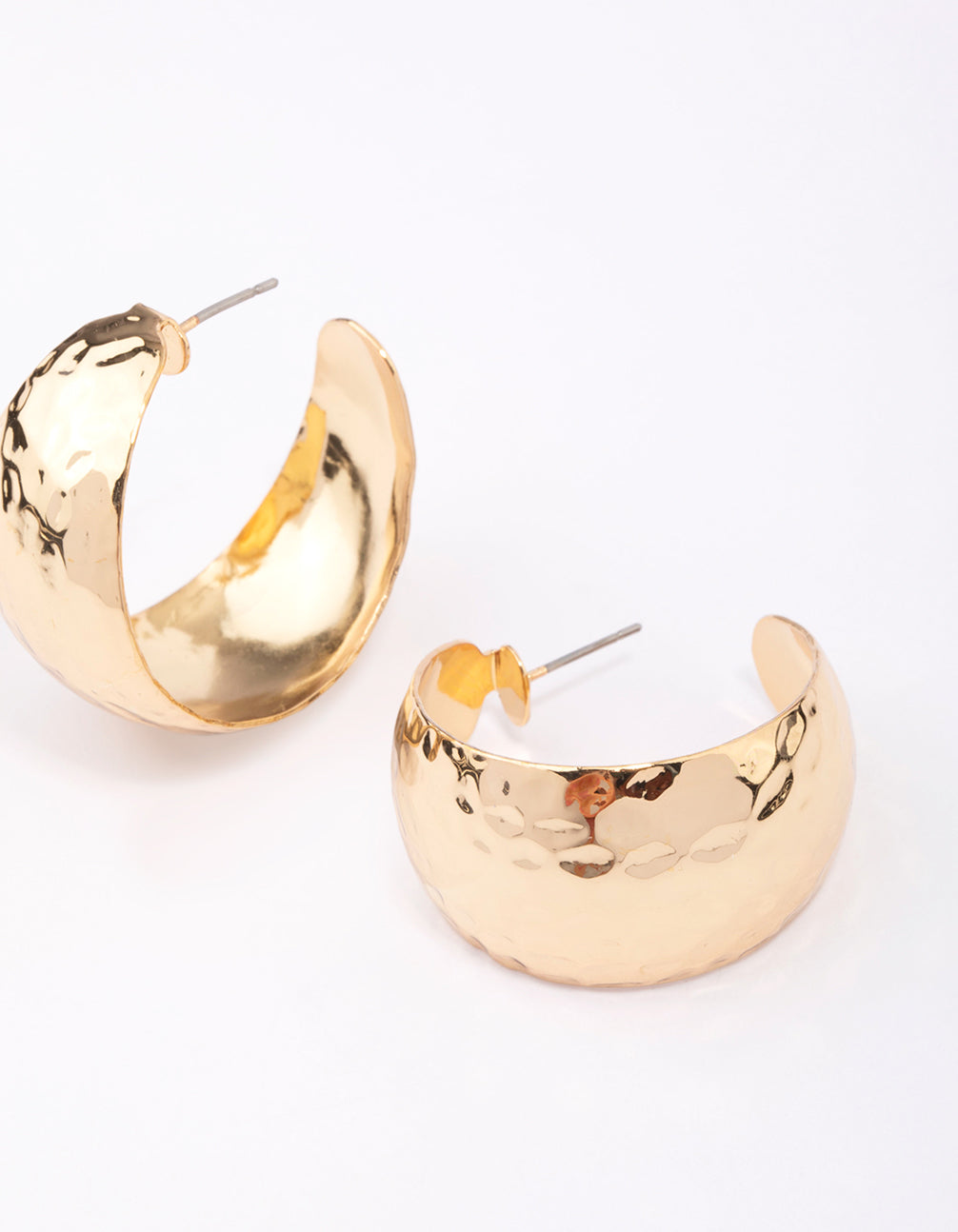 This set of wide gold plated hoop earrings feature a unique hammered texture for added interest.