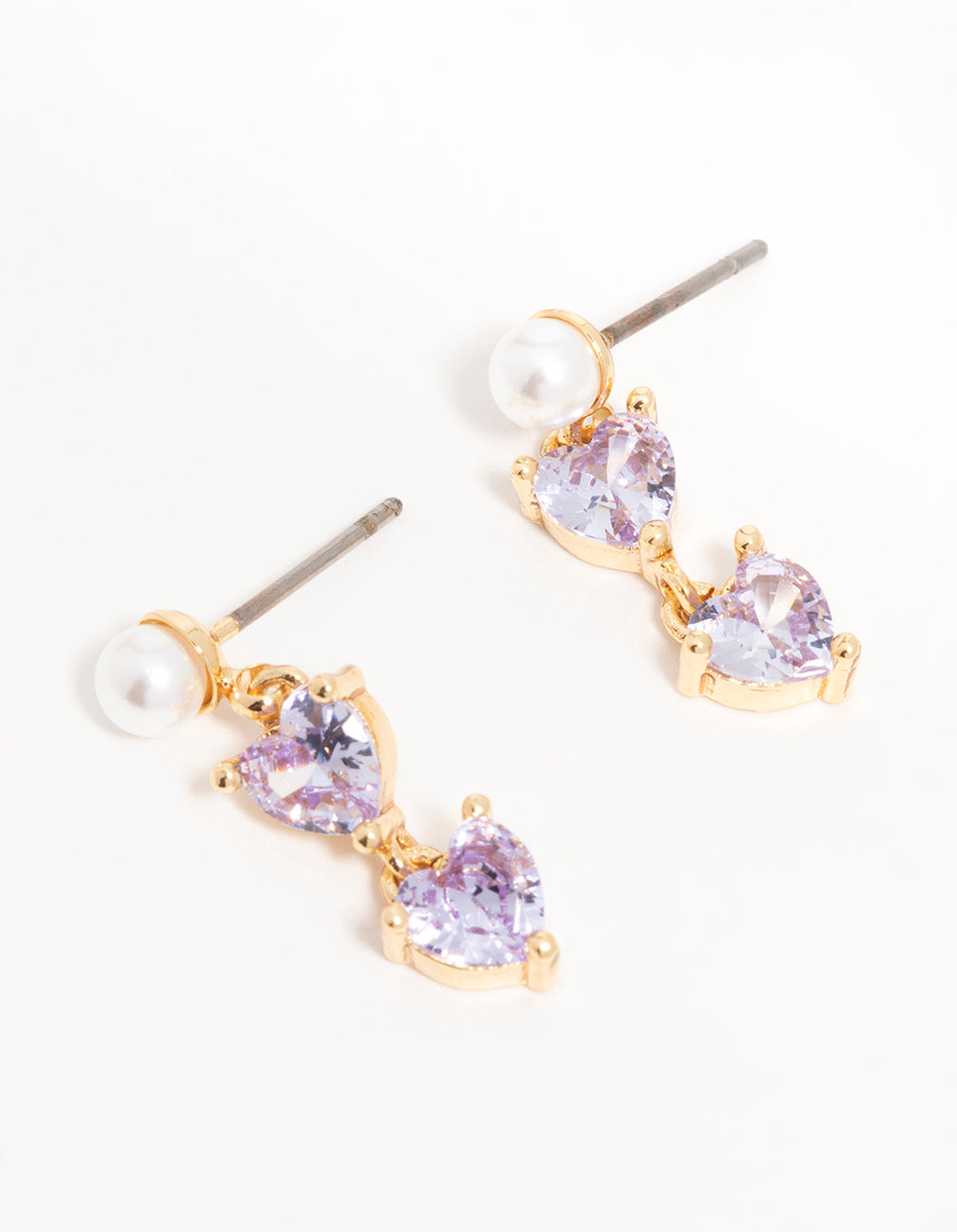 Gold Plated Purple Cubic Zirconia Pearl Dainty Heart Drop Earrings