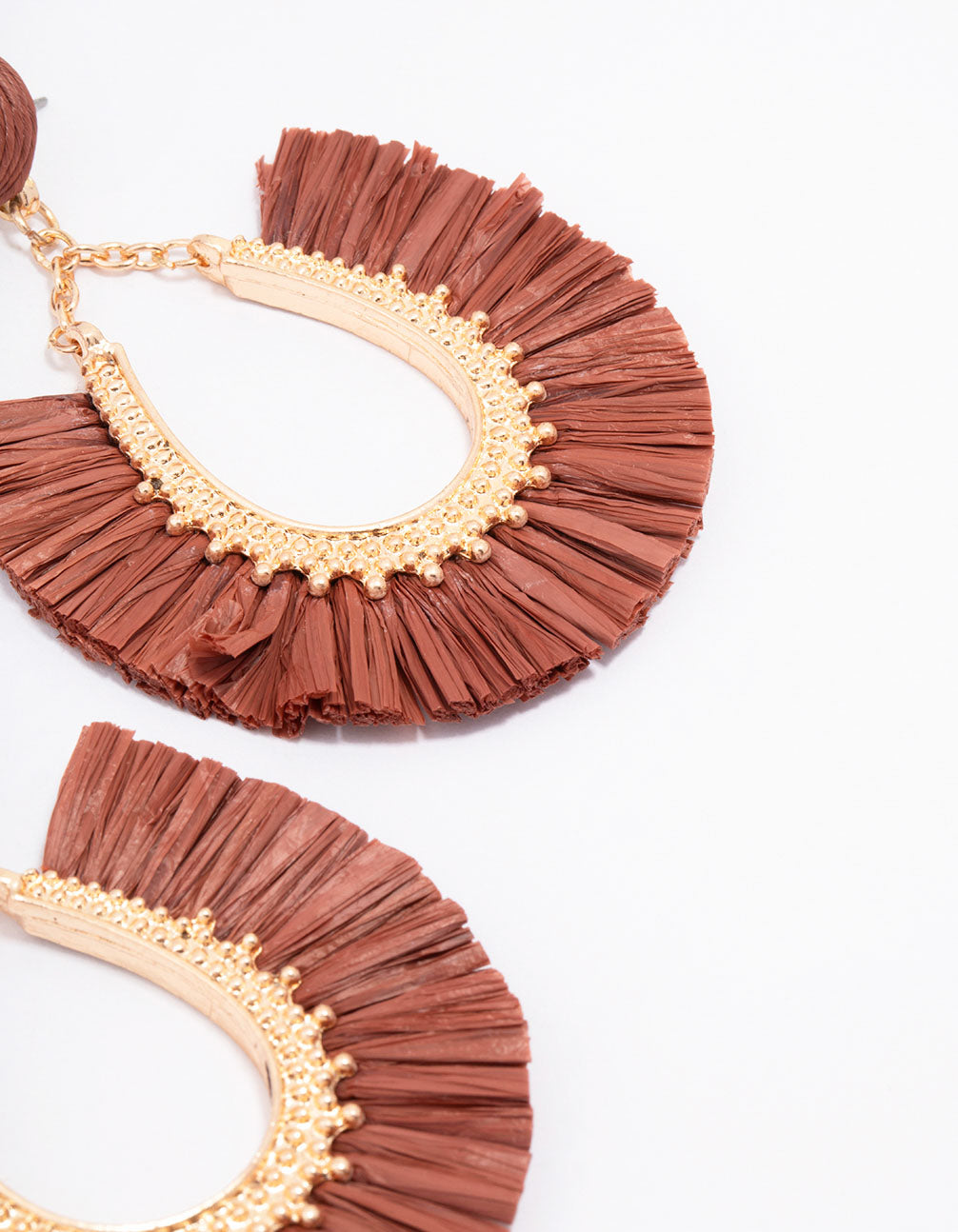 Add texture to your look with these warm-toned statement earrings. These drop earrings feature a gorgeous, gold-toned setting and maroon, raffia fringe. Perfect for warming up your look this season!