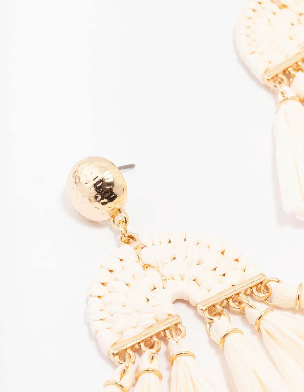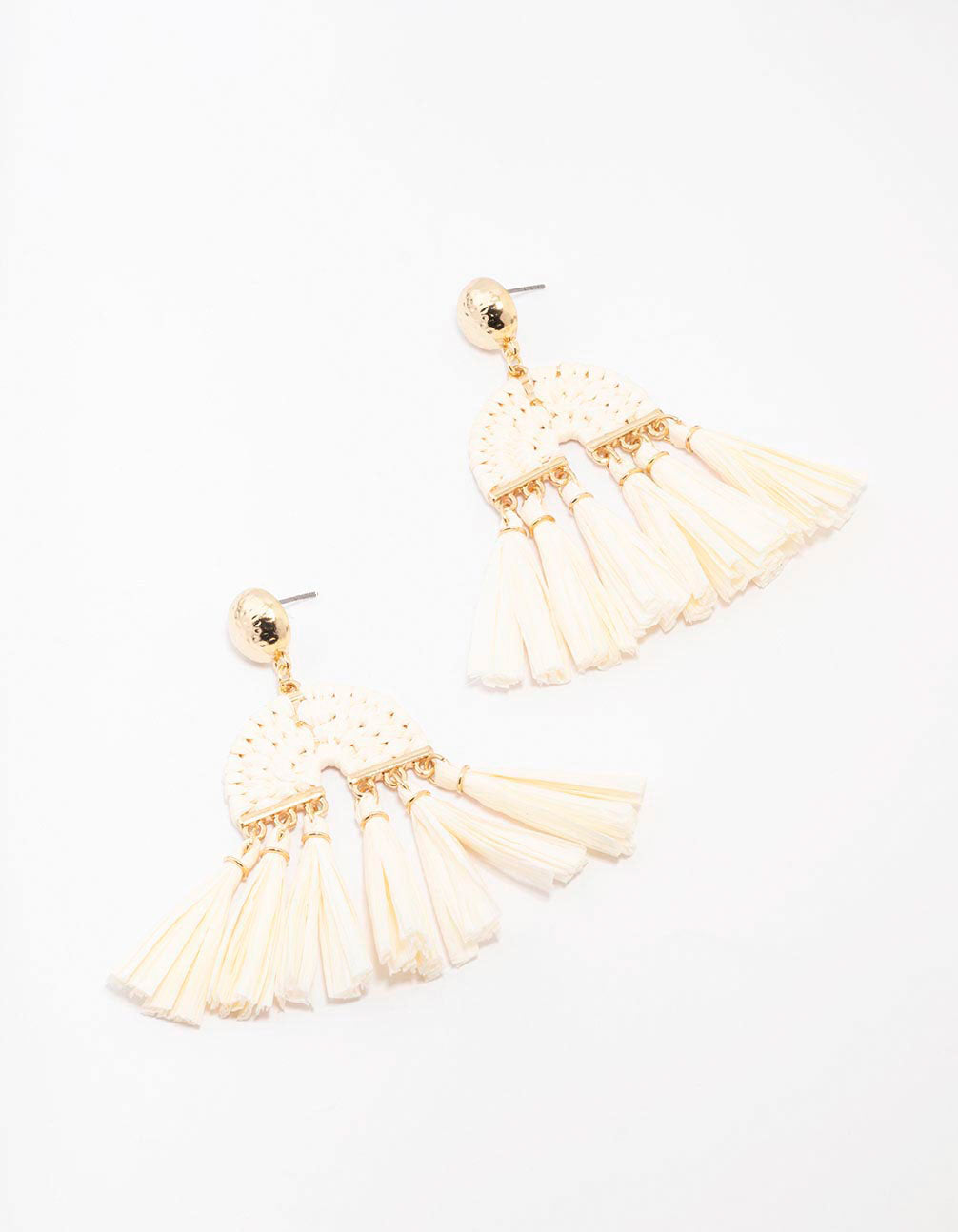 Accessorise like you're on vacation with these fabric, raffia drop earrings. These unique statement earrings feature a collection of textured tassels, in a neutral cream colour.