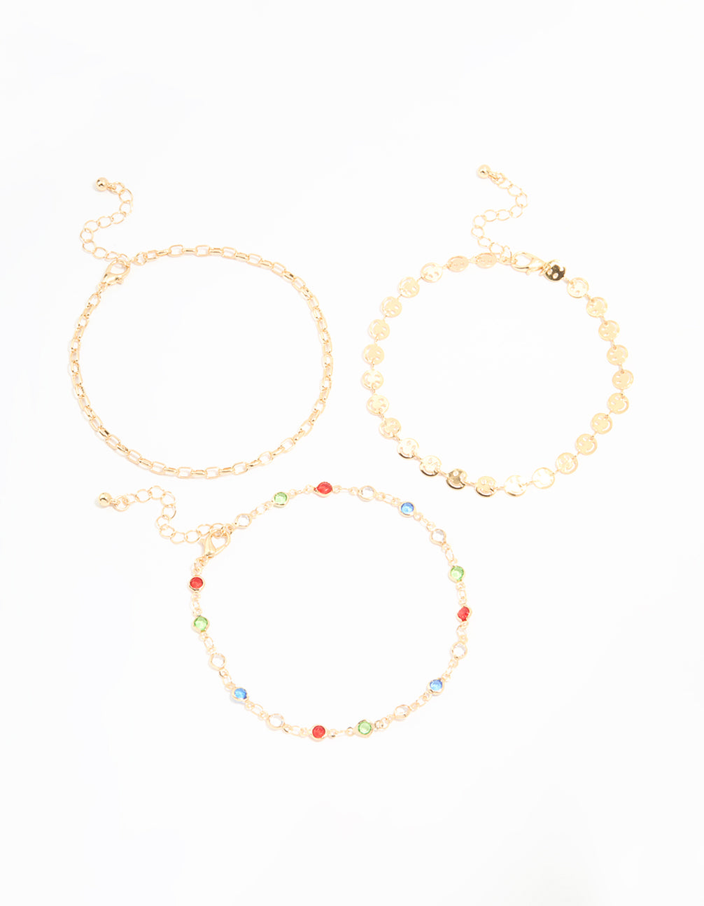 Gold Rainbow Stone & Chain Anklets 3-Pack
