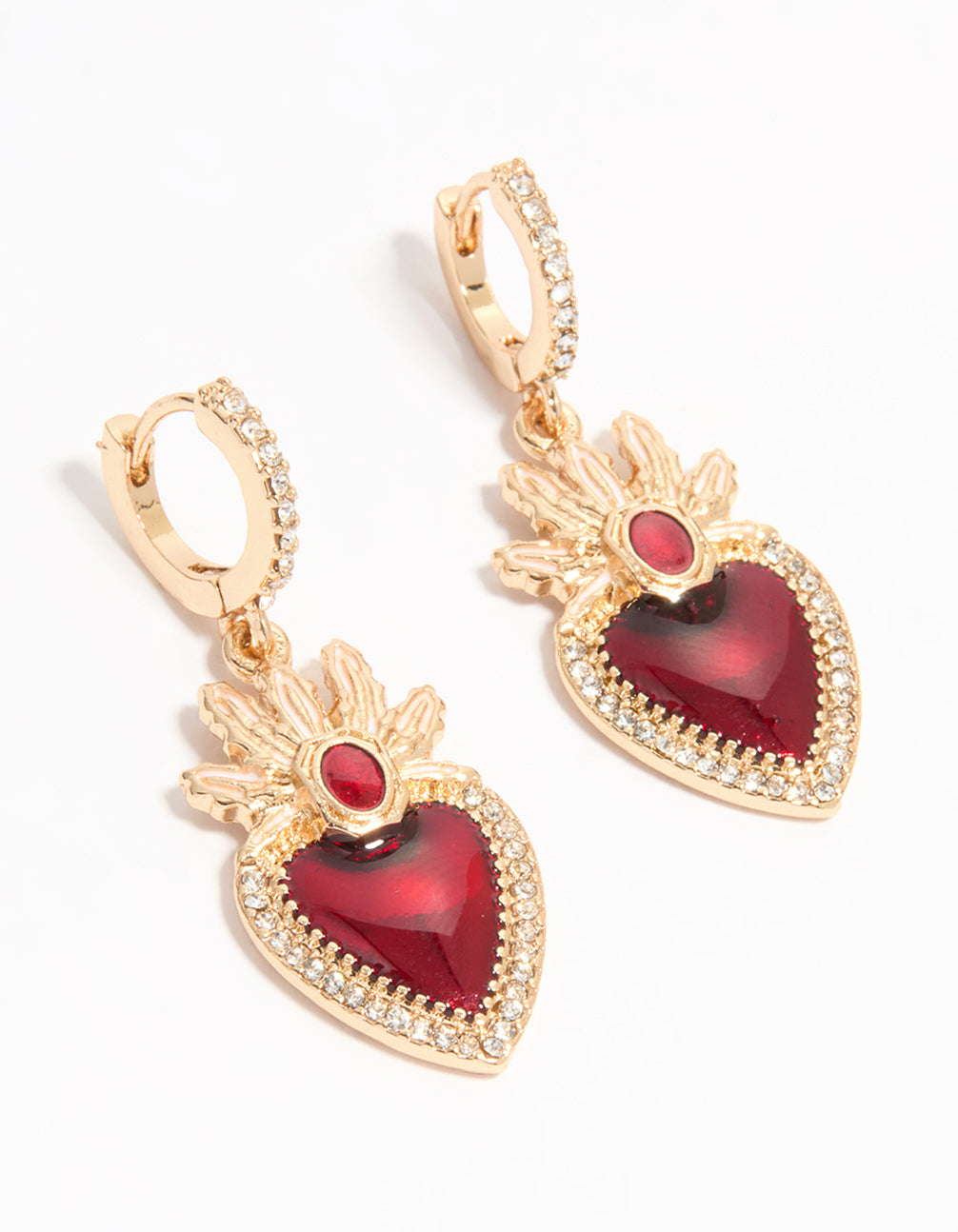 Gold Red Enamel Flaming Heart Huggie Earrings