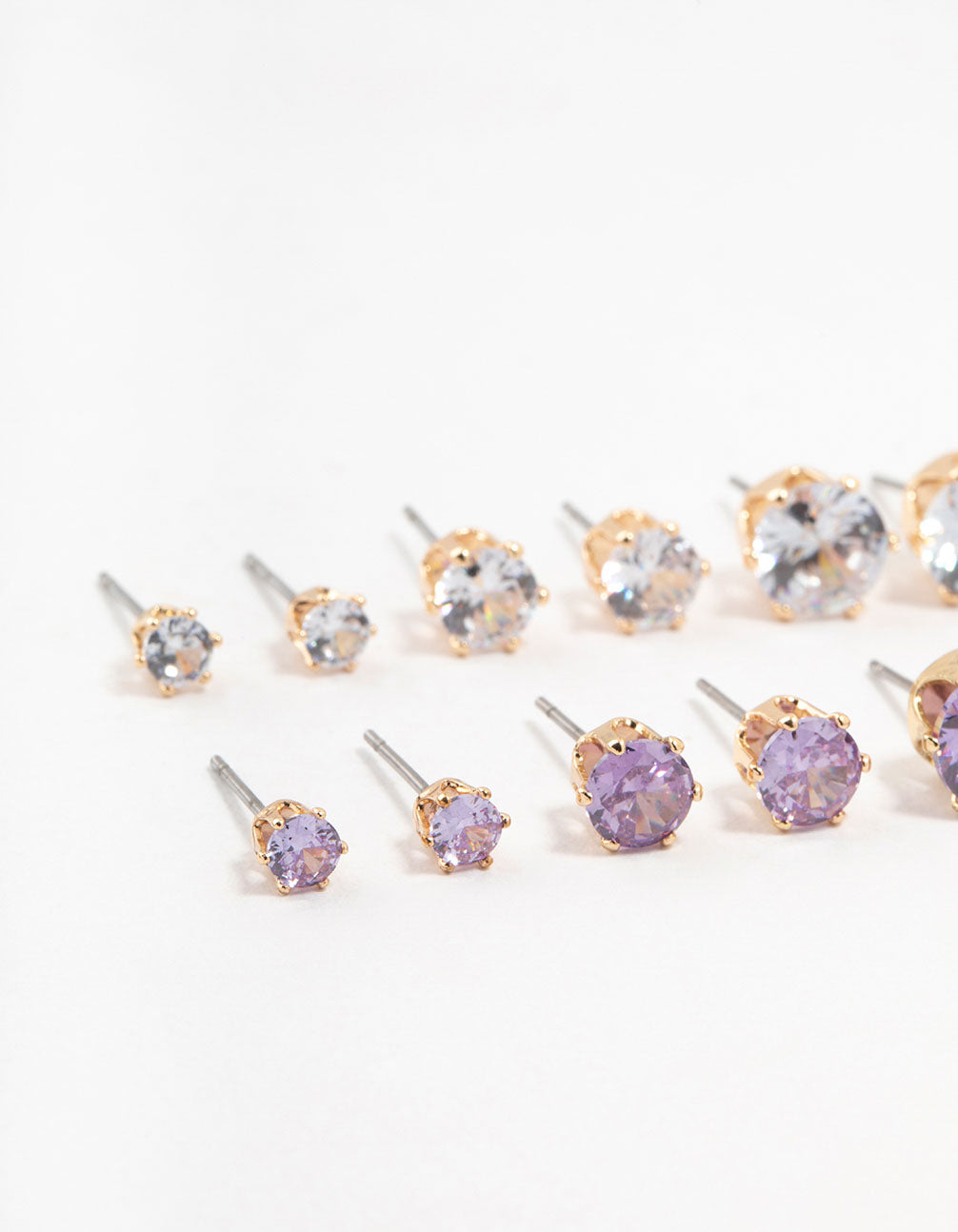 Gold Round Silver & Purple Cubic Zirconia Stud Earrings 6-Pack