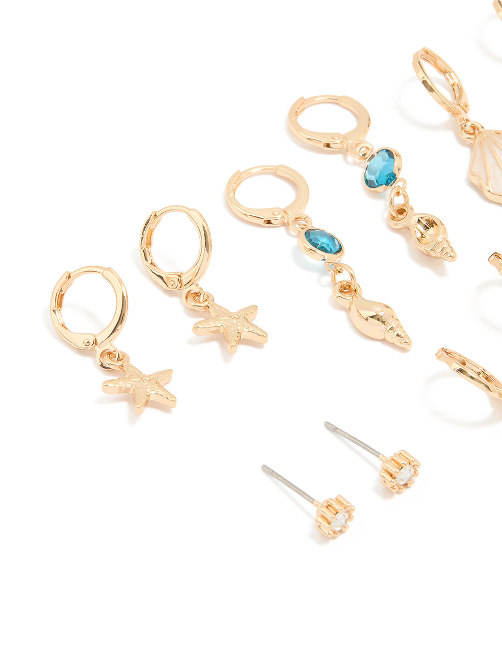 Dive into ocean-inspired elegance with this Gold Sea-Themed Hoop Earrings Pack. This earring set is perfect for adding a touch of coastal charm to your outfits. The set includes starfish-shaped huggie earrings, blue diamante and smooth gold shell hoops, delicate clamshell huggies, sparkly diamante studs, textured shell hoops, and simple gold-tone studs. With their gold-plated finish, these hoop earrings and studs are lightweight and versatile, making them ideal for beach holidays, casual daywear, or even dressed-up summer nights.