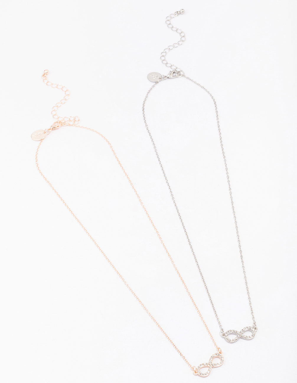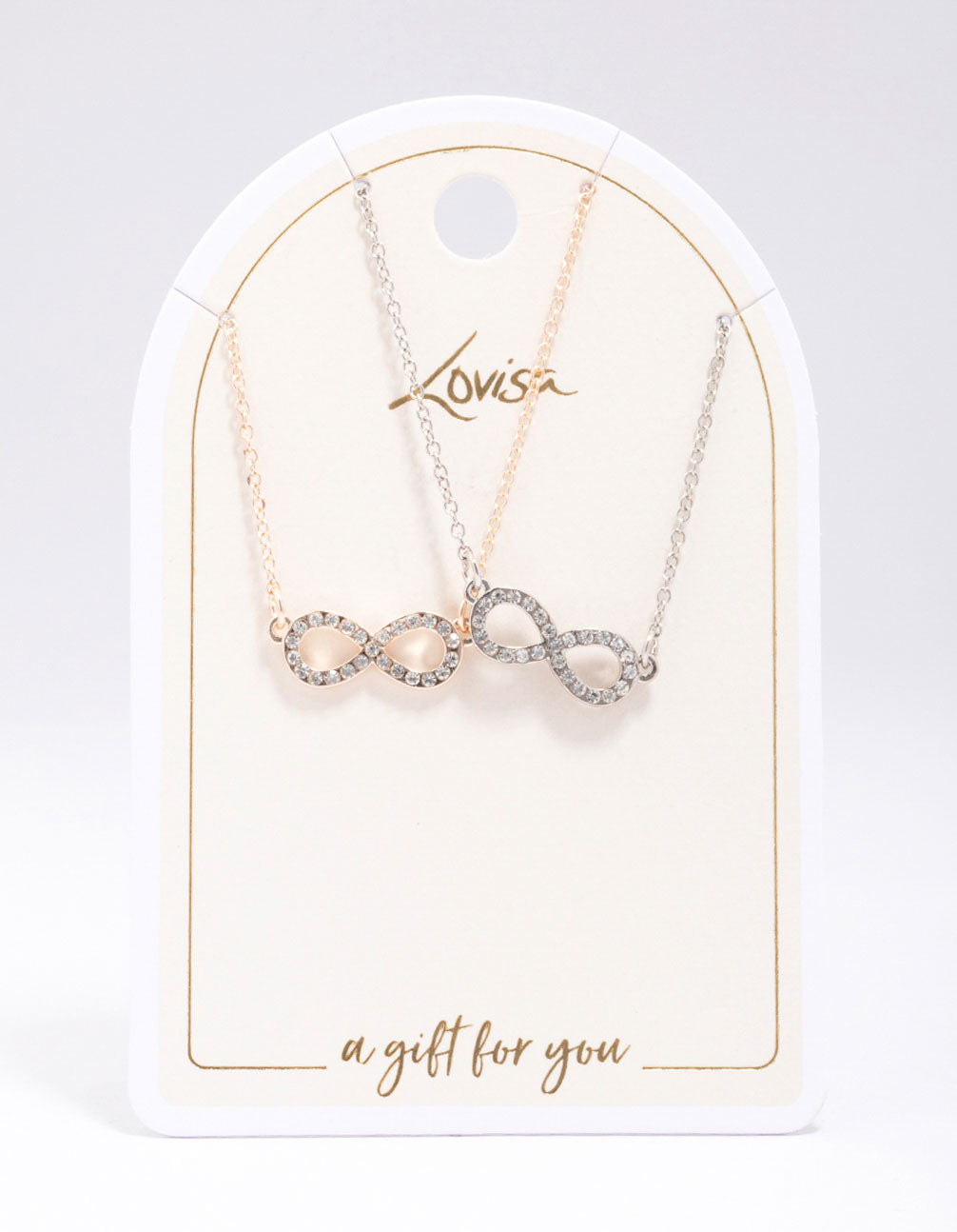 This necklace duo contains two individual pendant necklaces, one in a gold setting and the other in silver. Both pendants feature an eye-catching, infinity symbol for a timeless touch.