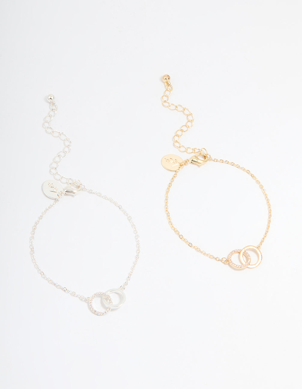 Celebrate Mum in style with this Gold & Silver Plated Brass Cubic Zirconia Link Bracelets Pack. This stunning set includes two unique bracelets: a gold-plated design featuring a chic linked circle design with sparkling cubic zirconia crystals at its centre, and a silver-plated one adorned with the same cubic zirconia linked design. Perfect for layering or wearing solo, these bracelets add a touch of timeless elegance to any outfit, whether Mum's dressing up for a special occasion or keeping it casual. Why not share the style by wearing one to match with Mum? A thoughtful, versatile jewellery duo that's perfect for making memories together!