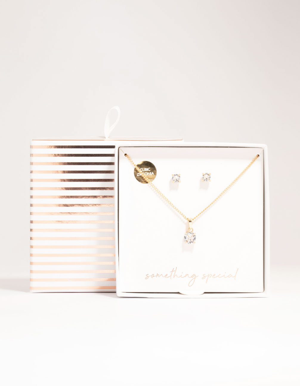 Gold Cubic Zirconia Solitaire Necklace & Stud Earrings Set