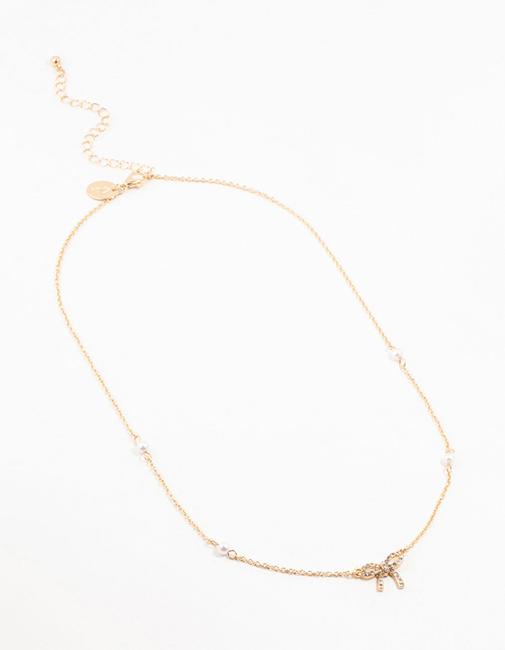 Gold Plated Station Pearl Diamante Bow Pendant Necklace