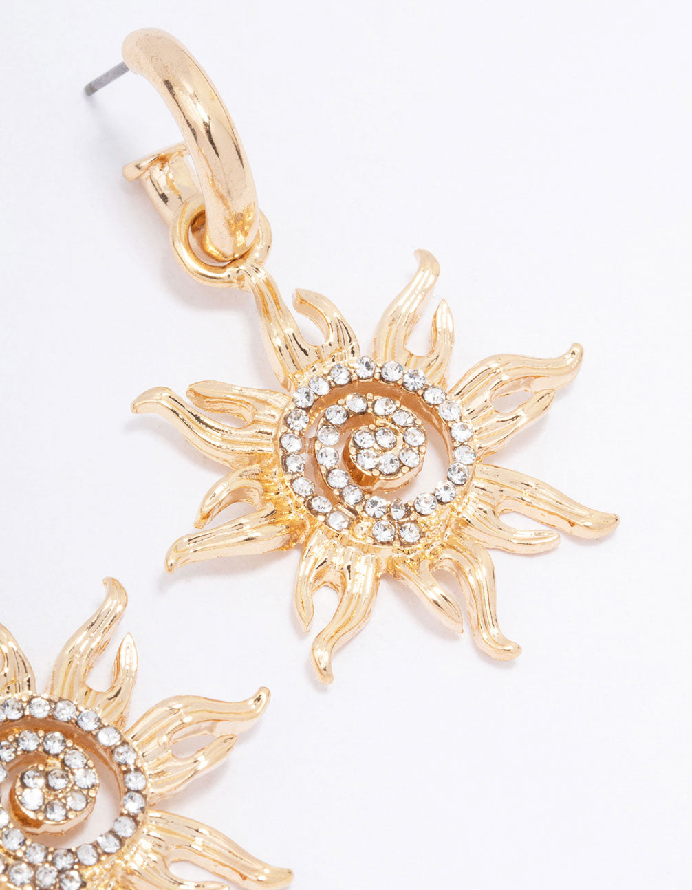 For an ethereal finish to your look, style these golden drop earrings. These unique statement earrings feature a swirling sun design, encrusted with mini diamantes in the centre.