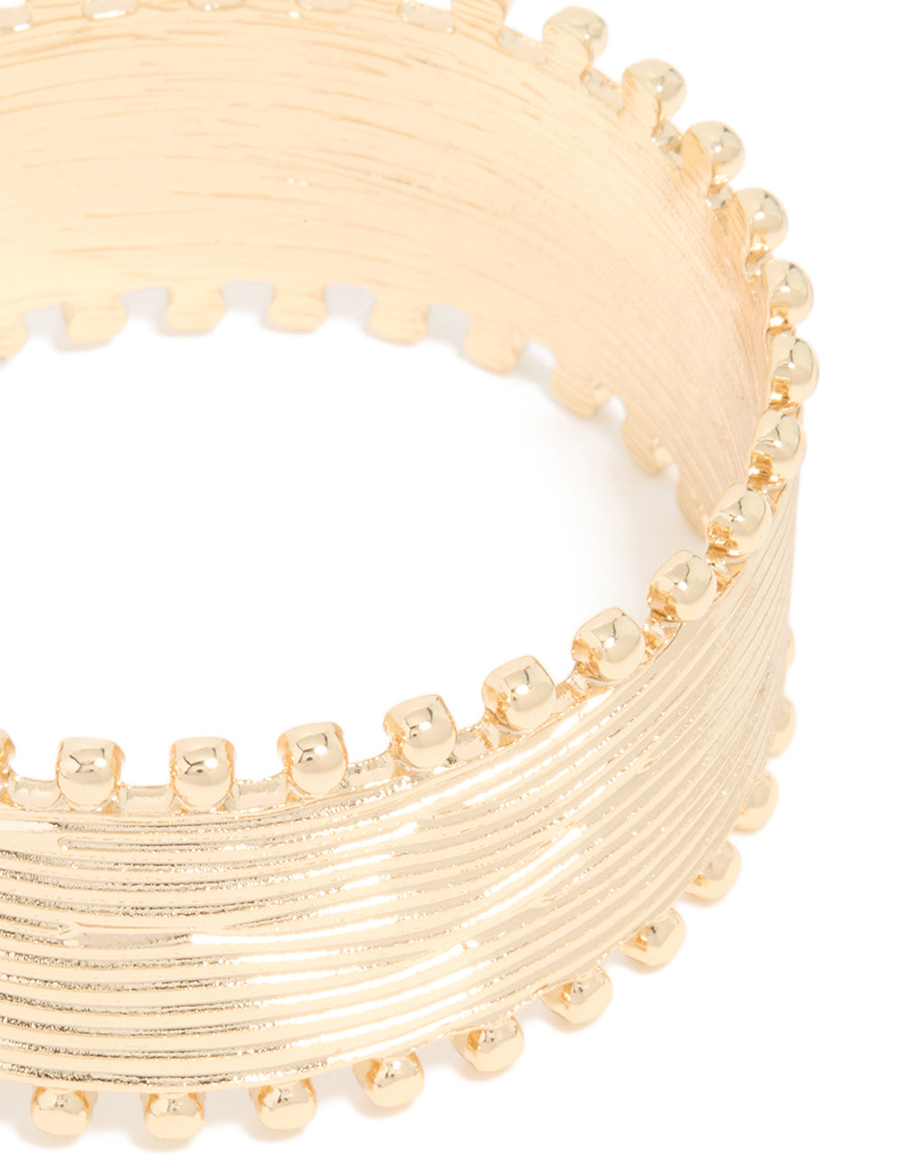 Elevate your everyday look with this Gold Textured Ball Edge Wrist Cuff. This chic wrist cuff features a sleek gold-tone finish with intricate textured detailing and a unique ball edge design, making it a standout accessory for any occasion. Whether you're heading to brunch with friends or dressing up for a night out, this versatile bangle pairs beautifully with everything from flowy dresses to tailored blazers. Wear it solo for a minimalist vibe or stack it with other bangles for a layered, cool look. Perfect for adding a touch of elegance to your jewellery collection, this bangle is your go-to for effortless style.