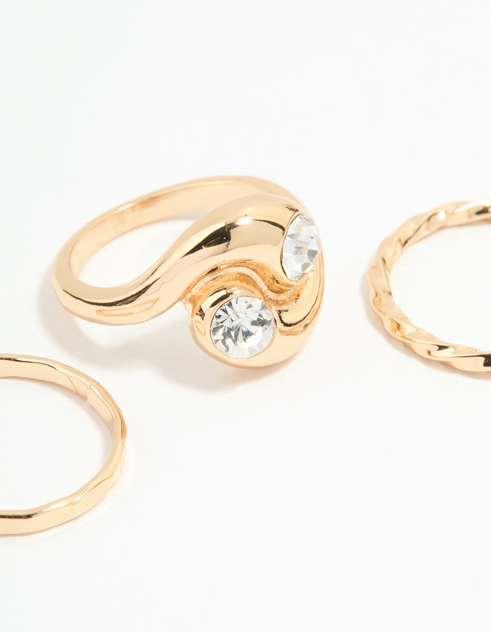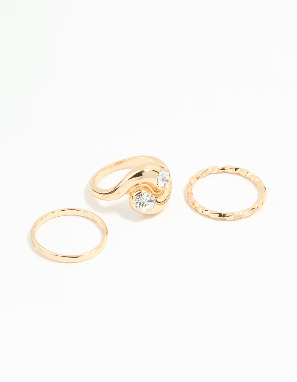 Gold Plated Thick Diamante Twisted Rings 3-Pack