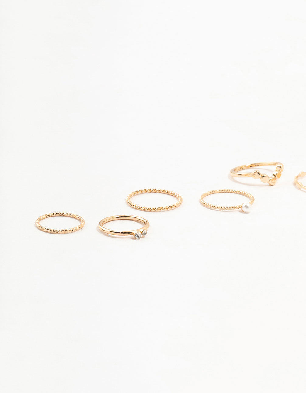 Create a stunning ring stack with this luxe gold-toned set. Featuring pearls, diamantes, twisted, rope, and sleek designs, these rings are perfect for crafting a unique and sophisticated look.