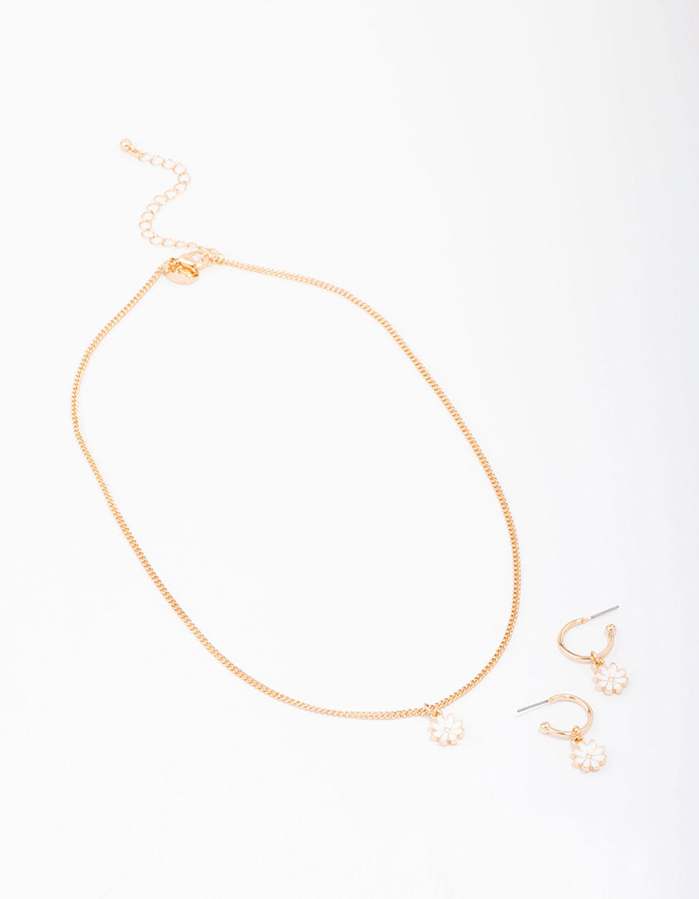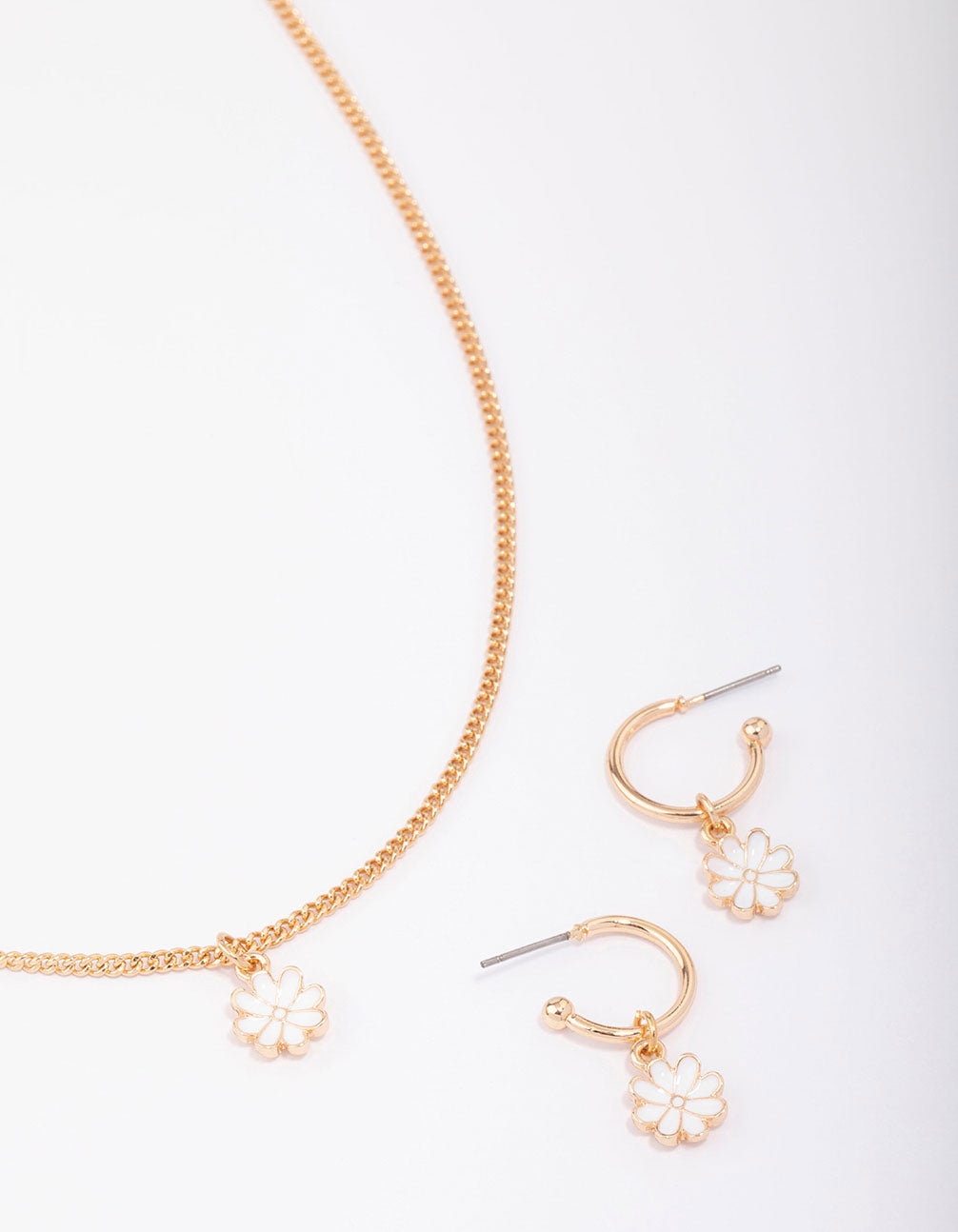 This set features a gorgeous, gold-toned daisy pendant necklace and pair of adorning hoop earrings to match.