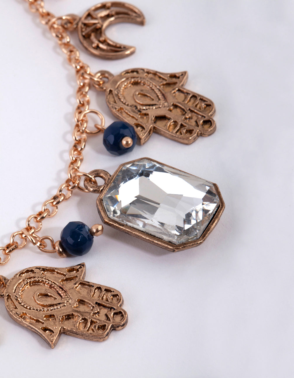 Let out your inner earth child with this funky necklace! It's gold toned and features a colourful beaded design with hamsa hand motifs and diamante embellishments. Wear it with bold colours or lace for a free-spirited look.