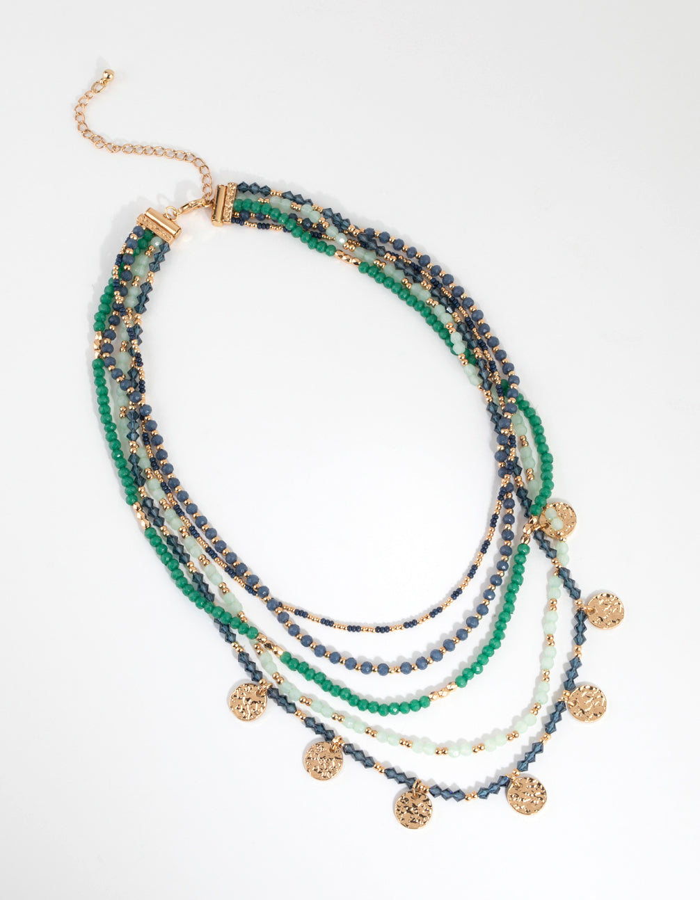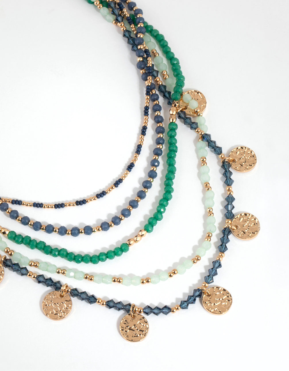 Keep things mysterious with dramatic jewellery that shines in an array of peacock tones. This beautiful gold-toned necklace boasts a stunning beaded design in a series of vivid greens.