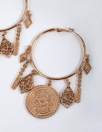 Embrace large pieces with ornate details. These gold-toned hoops boast an impressive size that's sure to get you noticed. They feature a series of hanging charms with intricate filigree patterns. Wear these with white or earthy tones for a free-spirited look.