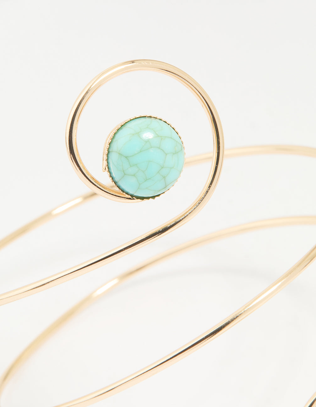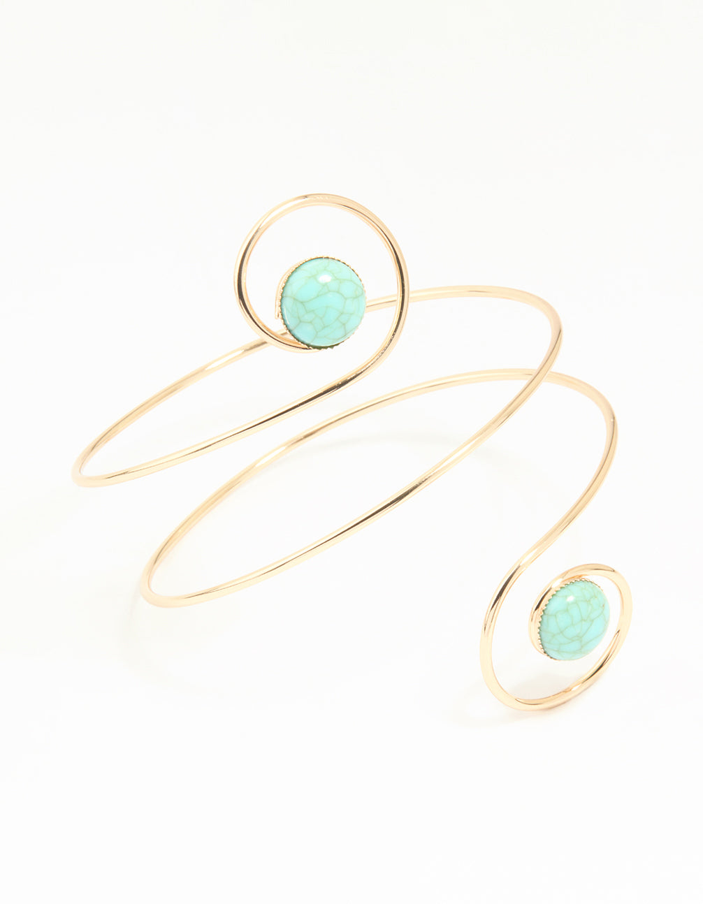 Add a splash of boho elegance to your look with this Gold Turquoise Swirl Stone Arm Cuff. This arm cuff features a swirling gold-tone design paired with a striking turquoise coloured stone, creating the perfect mix of bold and delicate. Ideal for festivals, beach days, or summer parties, this arm cuff is a must-have accessory for making a statement. Pair it with flowy dresses, cropped tops, or even a swimsuit for an effortlessly chic vibe. Whether you're dressing up or keeping it casual, this arm cuff adds a unique touch to any outfit. Perfect for those who love stylish yet versatile jewellery!
