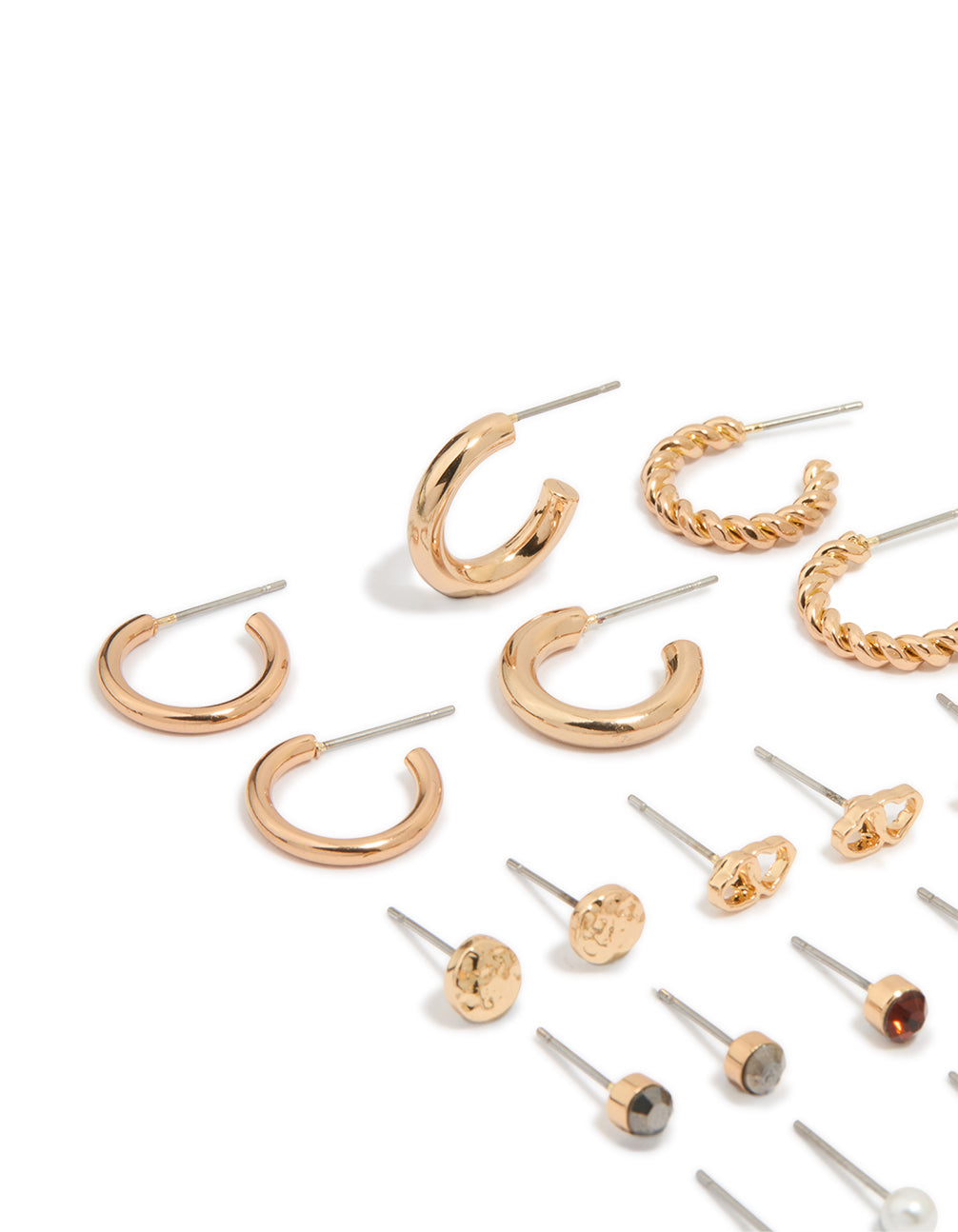 Gold Twisted Hoop & Classic Stud Earrings 12-Pack