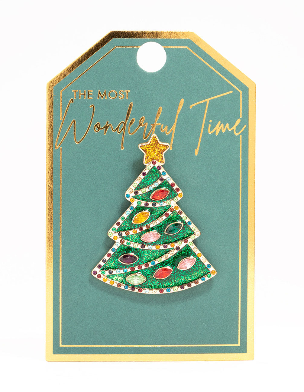 Get ready to spread holiday cheer with this stunning brooch. It features a vibrant festive tree motif, crafted using a glitter-effect enamel base and adorned with multicoloured diamante baubles. Perfect for a bold, festive look.