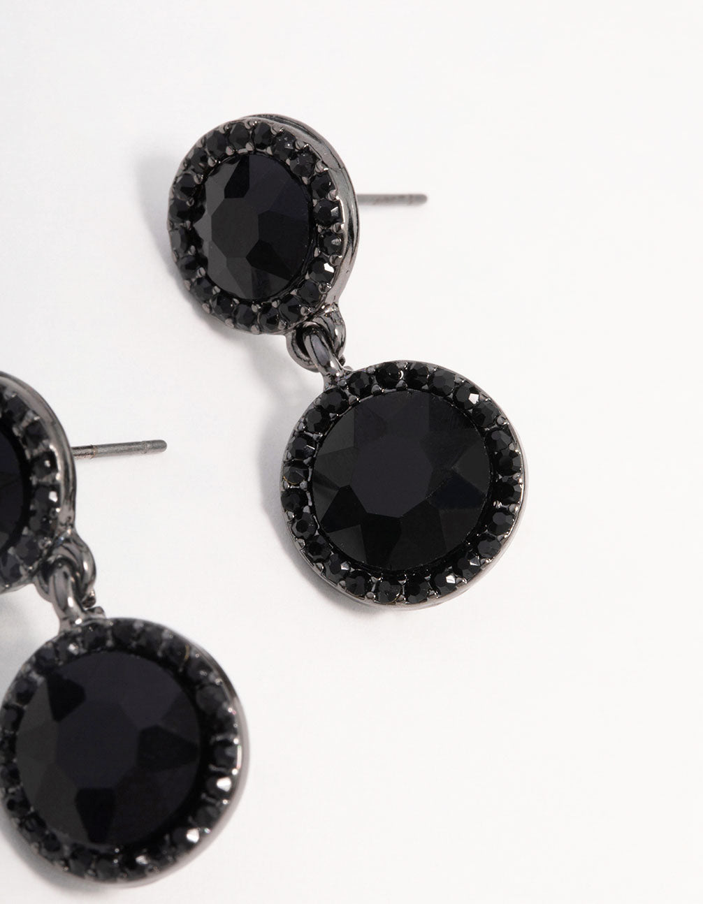 For a refined finish to your stack, style these elegant drop earrings. These lovely dangle earrings feature a gunmetal setting, adorned with two round black crystals for a touch of drama.