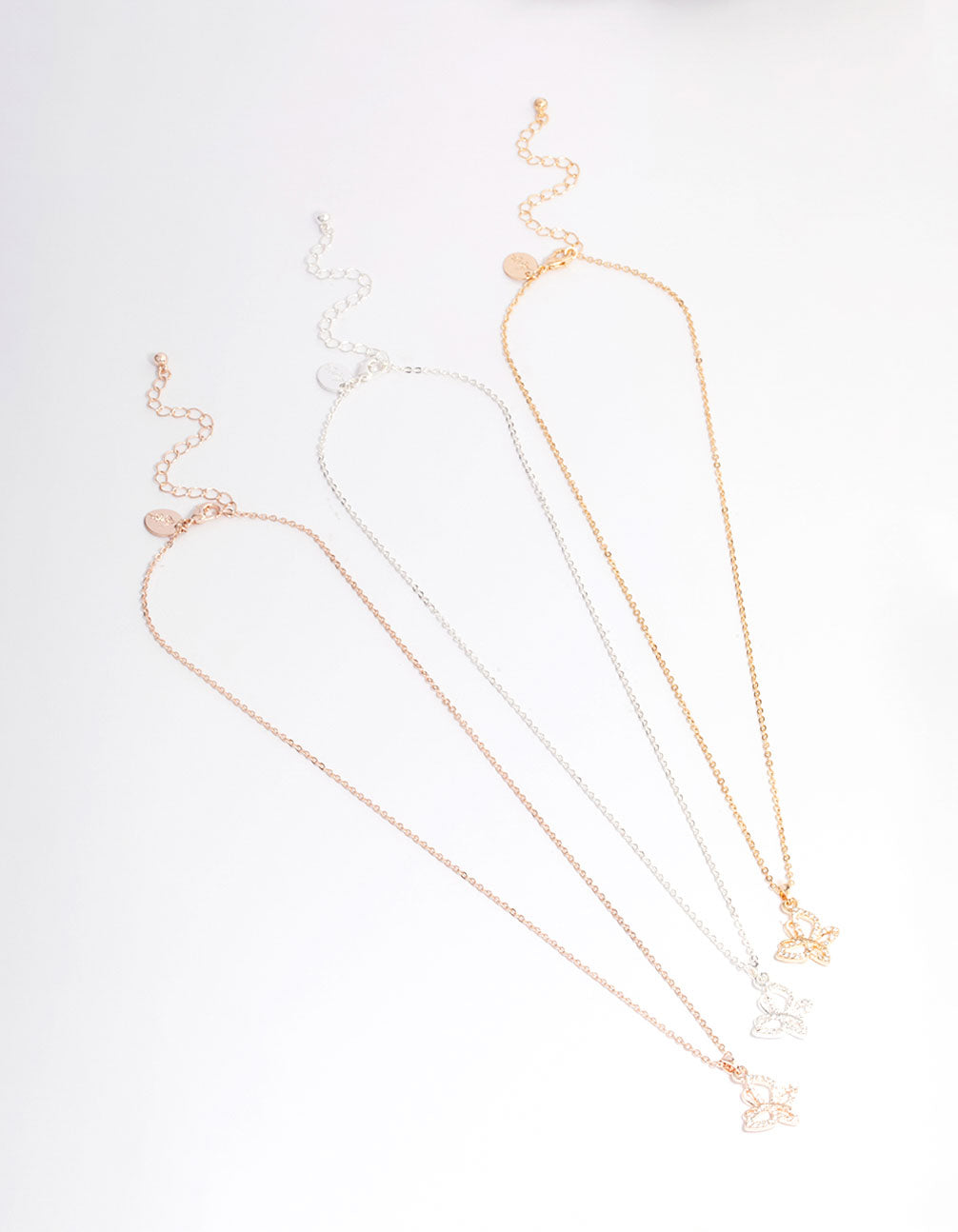 This gift box contains three individual pendant necklaces adorned with delicate butterfly charms in gold, silver and rose gold settings.