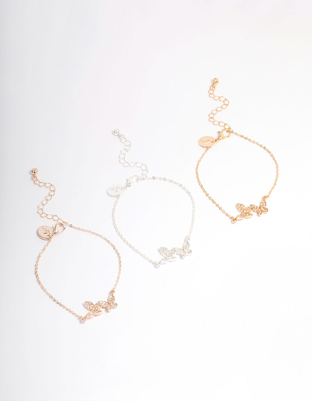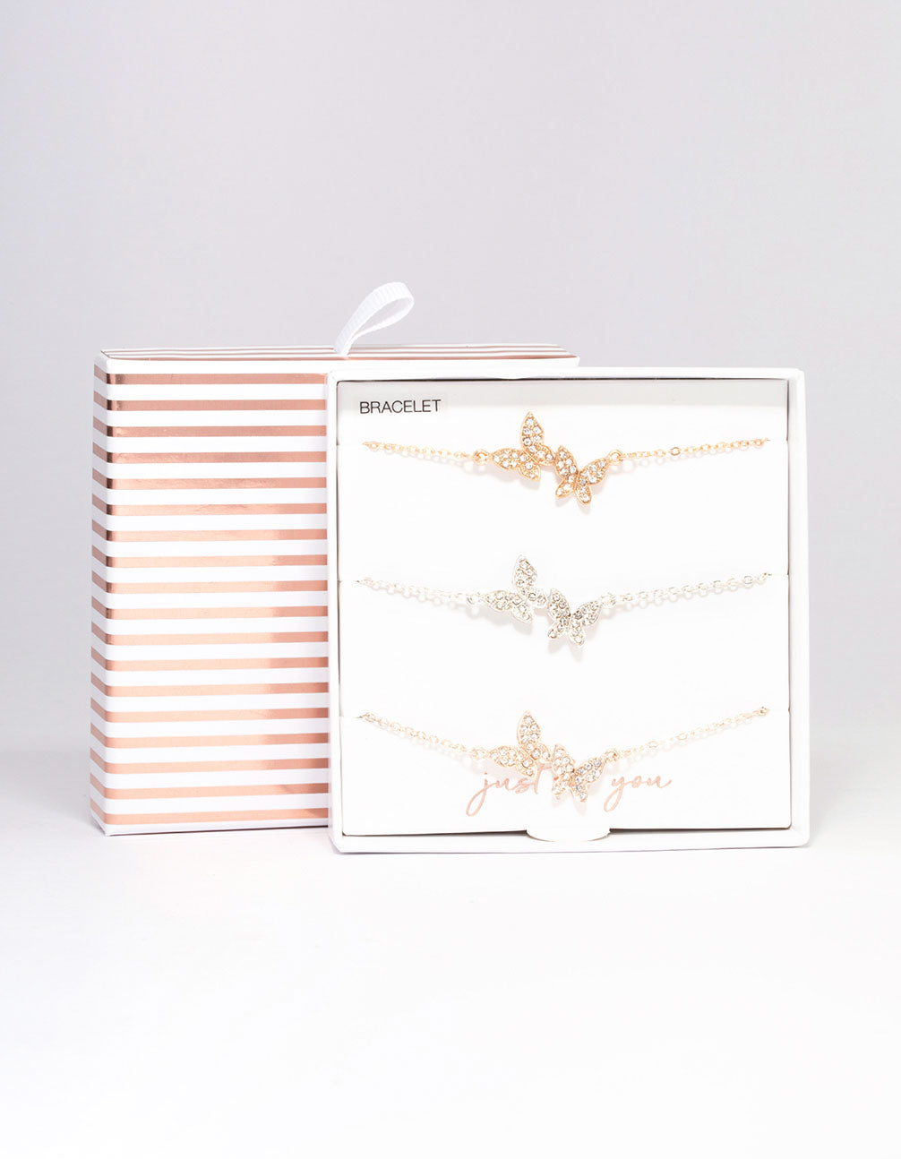 This gift box contains three individual charm bracelets adorned with glittery butterfly charms.