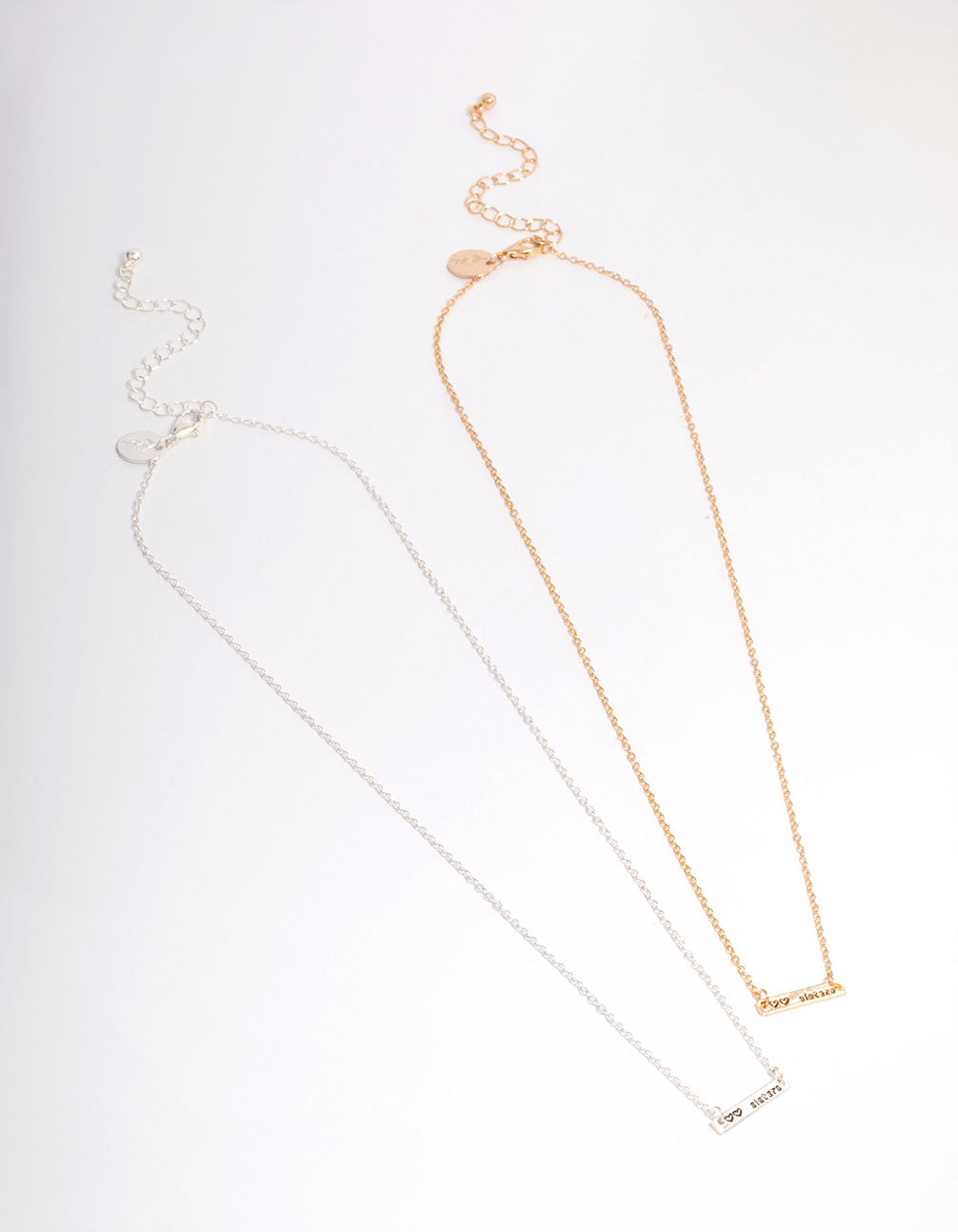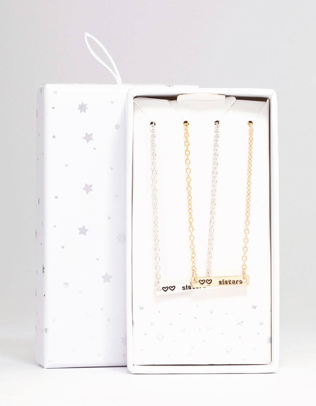 This gift box contains two individual pendant necklaces adorned with simple gold and silver bars etched with the words 'Sister.'
