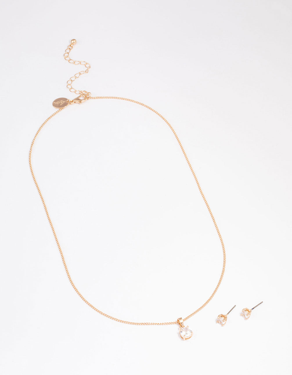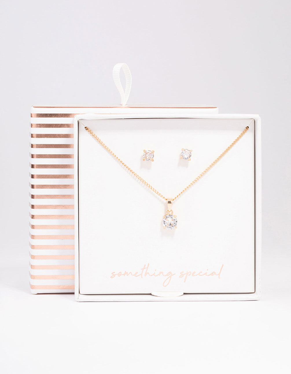 This gift box contains a simple gold-toned jewellery set adorned with solitaire crystals for a luxe finish.