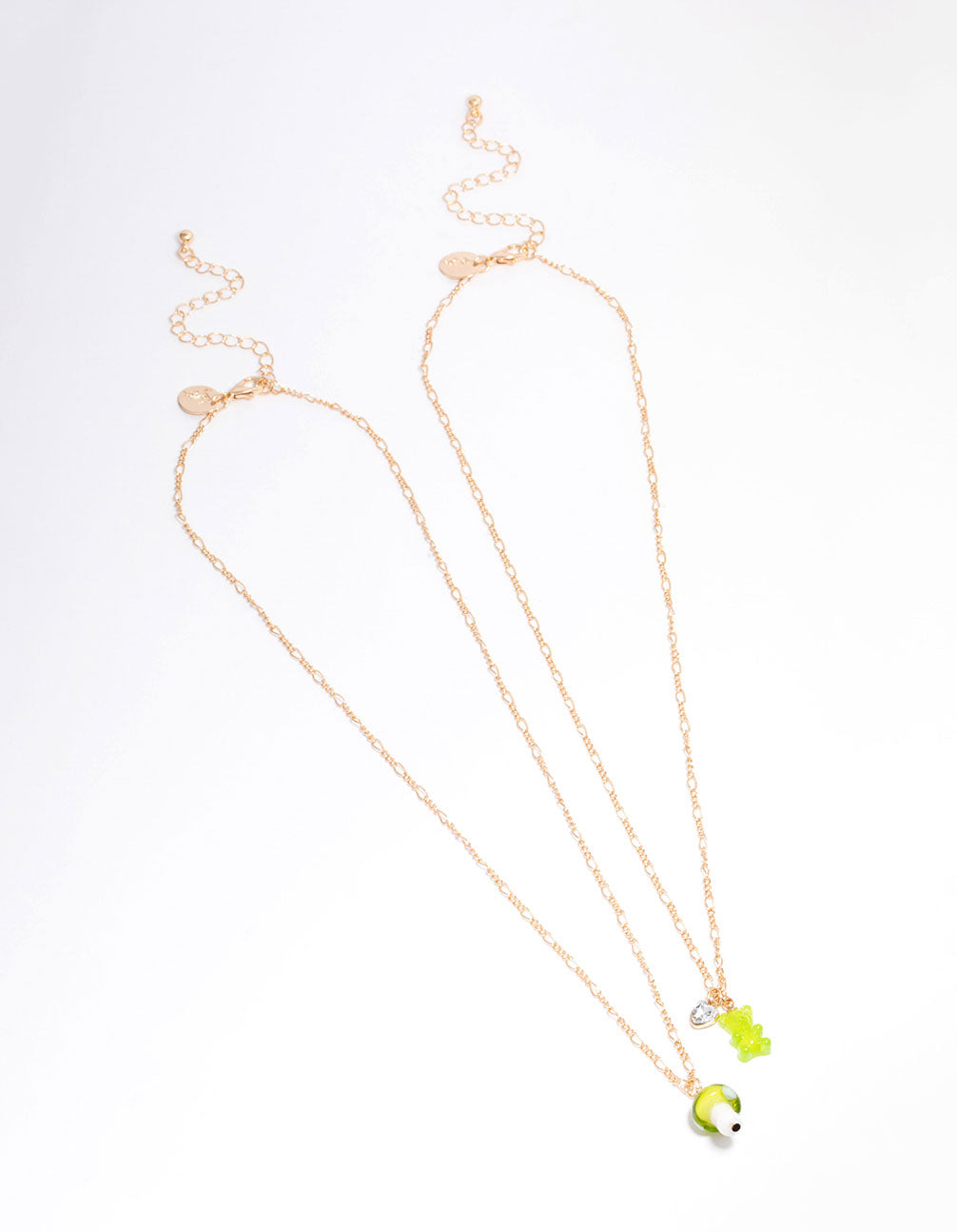 This gift box contains two gold-toned necklaces featuring green mushroom and gummy bear charms for a playful finish.