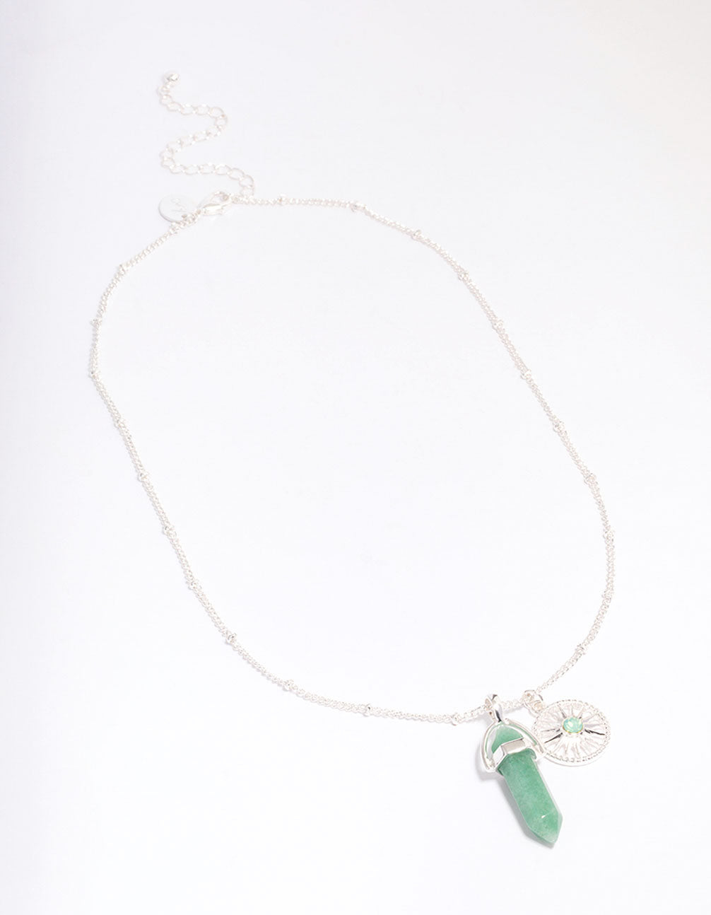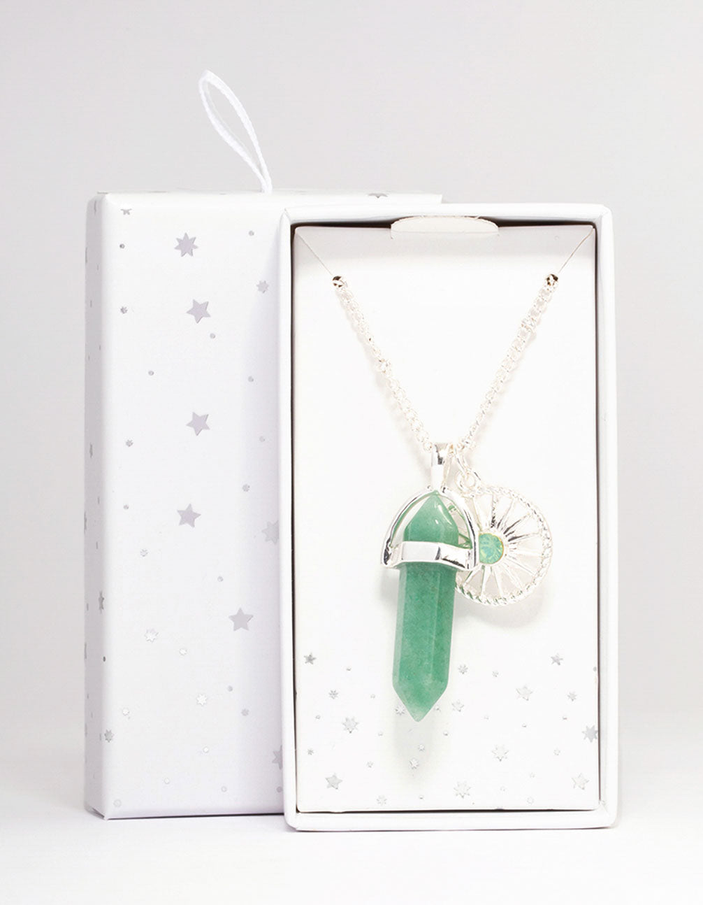 This gift box contains a silver-toned necklace adorned with a tapered green fluorite and disc charm.