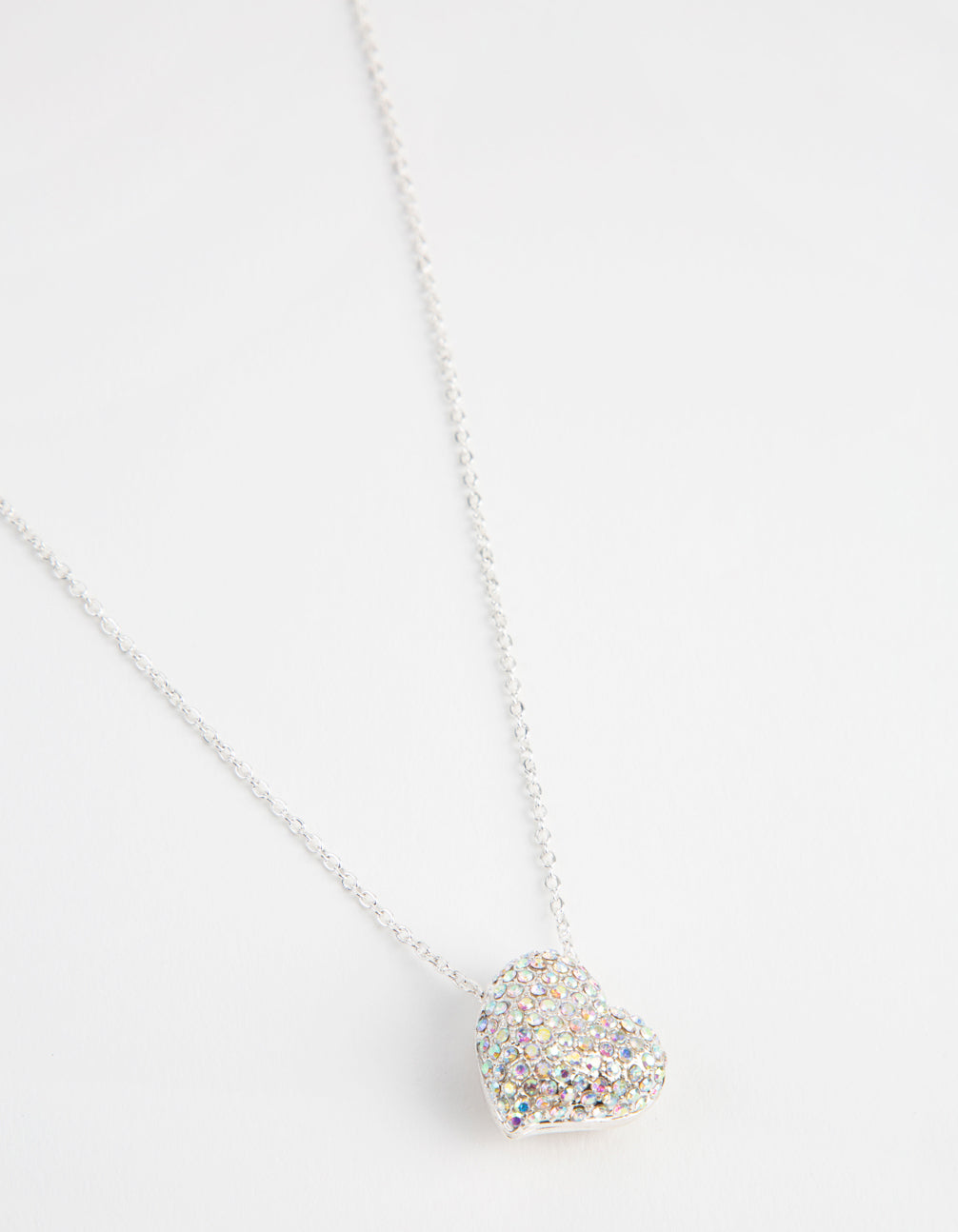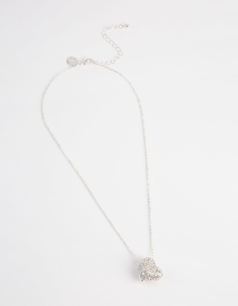 This silver-toned necklace is sure to make you sparkle! It features a chunky heart pendant, which hangs at a relaxed angle to its side. The heart is studded with diamantes that glimmer with a pinkish hue. Gift it to someone special, or treat yourself!