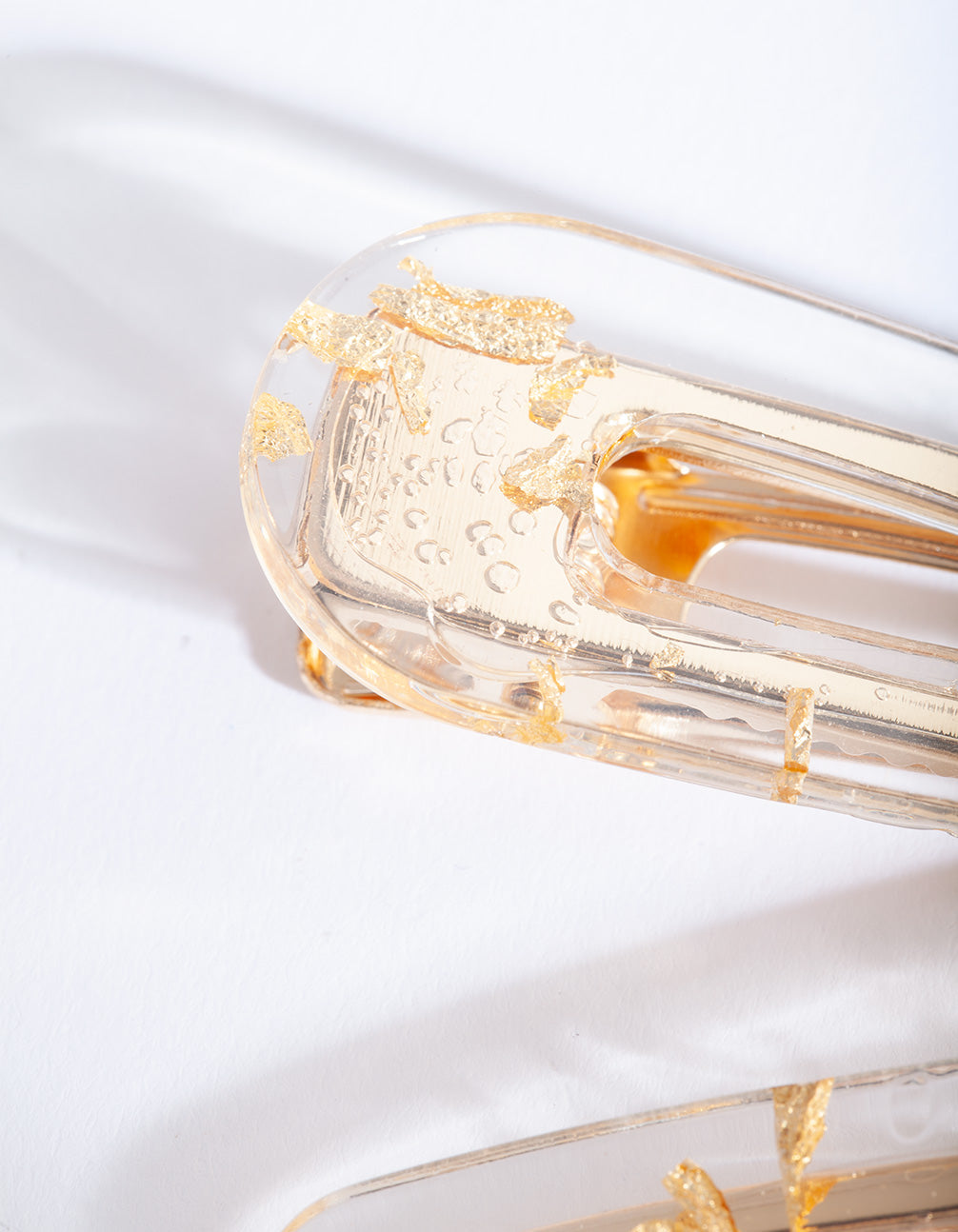 Playful and glamorous! Our hair accessories can dress up any outfit. This hair clip duo boasts a gold-toned fleck design suspended in acrylic.